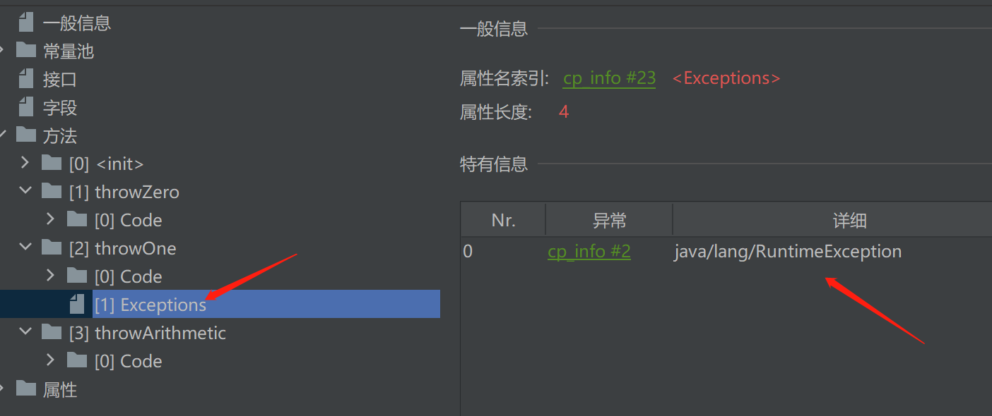 throwOne()对应的字节码指令如下,基本和上面没什么区别,但是会发现多了个和code属性并列的异常属性,说明code属性是用来刻画方法体的,而throws是在方法的声明处,是用来刻画方法的,所以是另外一个属性: