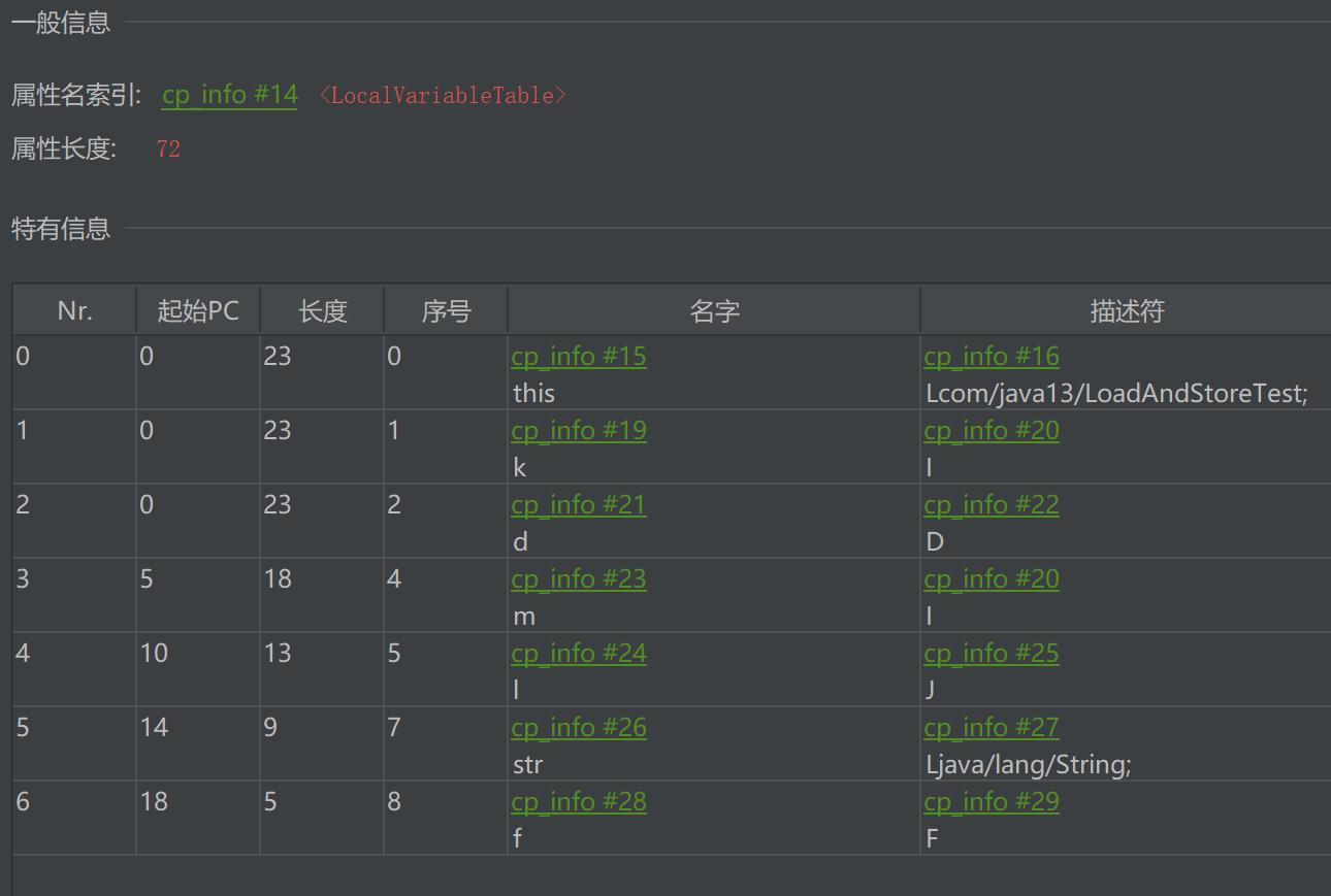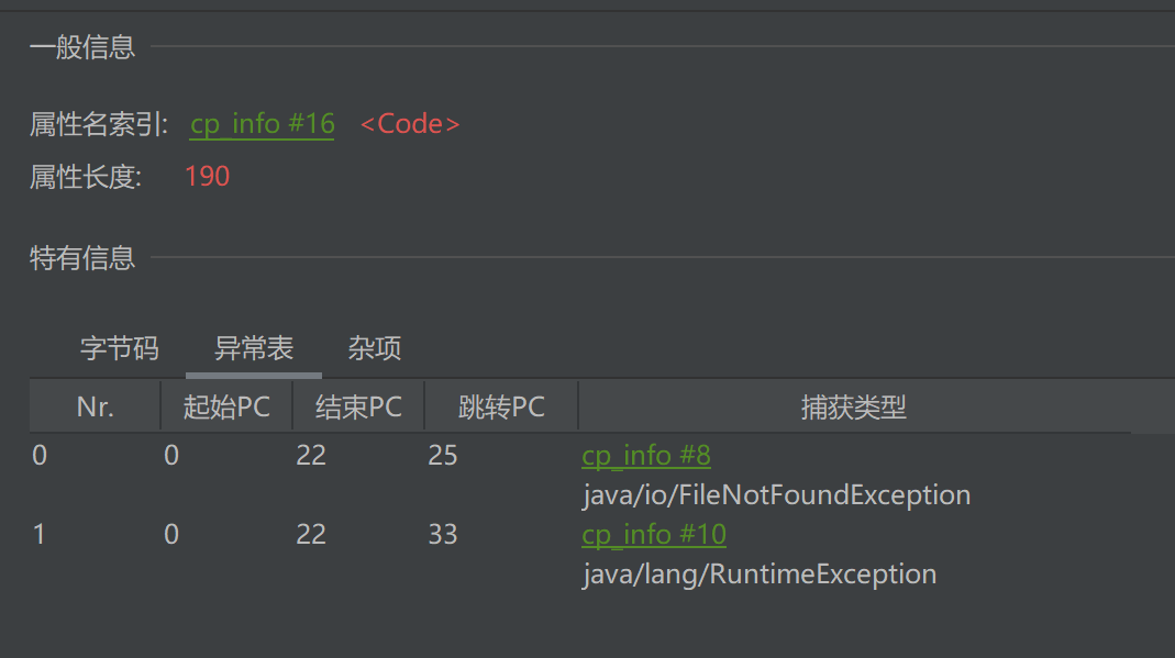 - 如果一个方法定义了一个try-catch或者try-finally的异常处理,就会创建一个异常表。它包含了每个异常处理或者finally块的信息。异常表保存了每个异常处理信息。比如: