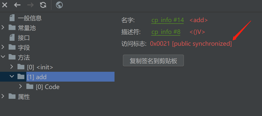 从字节码指令中看不出此方法的任何与synchronized有关的指令,因此是隐式的,相关描述是存放在方法的访问标志中的,如图: