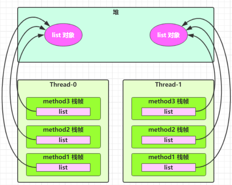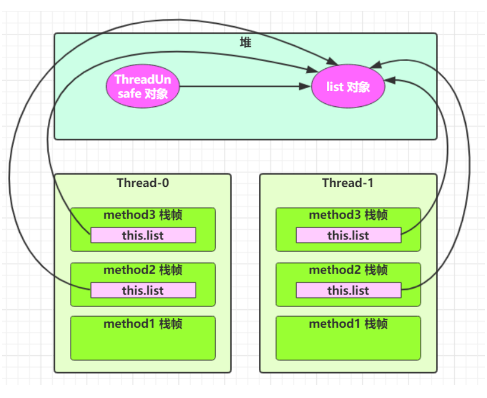 而当把list集合调至局部变量位置时,线程就安全了,因为此时不同线程调用的是各自栈帧中的list对象,不存在共享,代码如下: