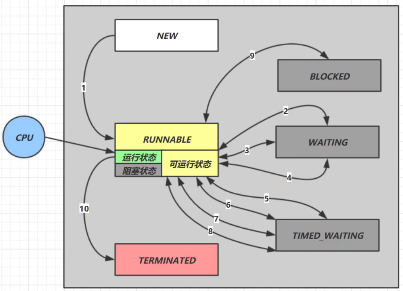 - 【RUNNABLE】 当调用了start()方法之后,注意,Java API层面的RUNNABLE状态涵盖了操作系统层面的【可运行状态】、【运行状态】和【阻塞状态】(由于BIO导致的线程阻塞,在Java里无法区分,仍然认为是可运行)。