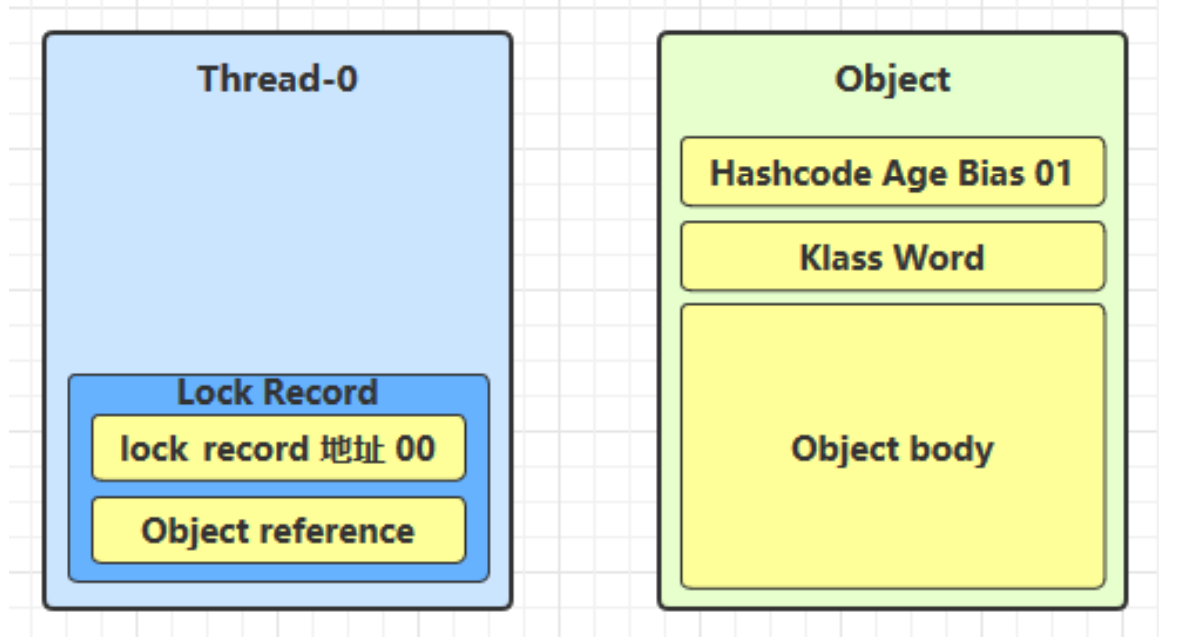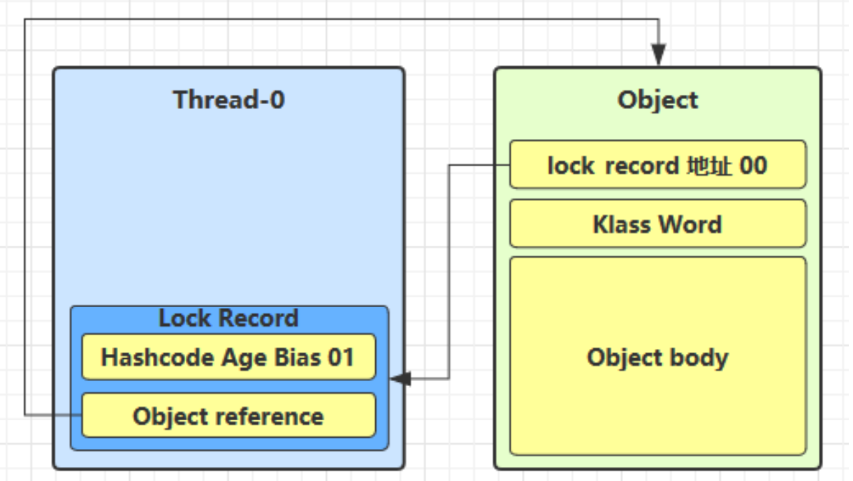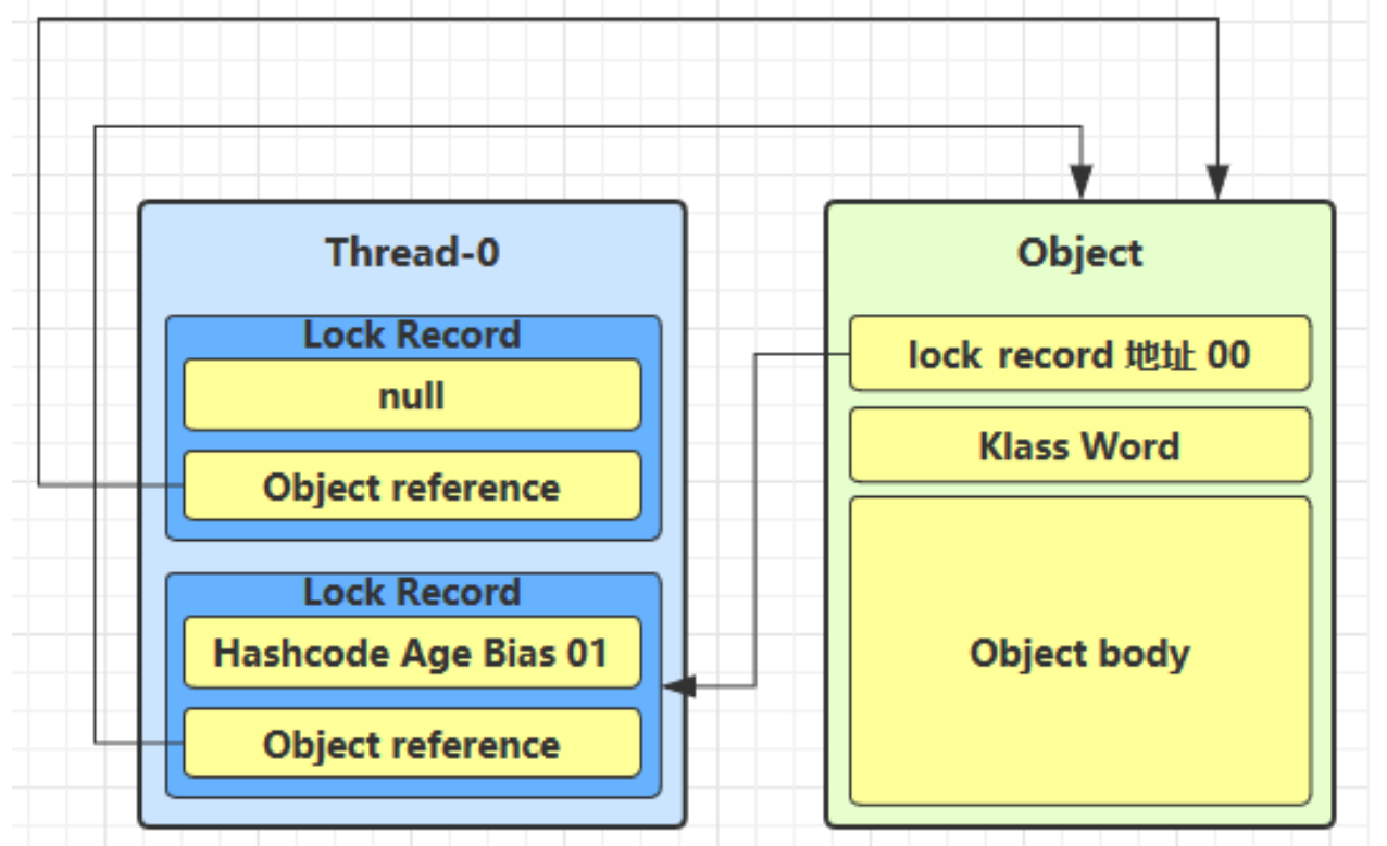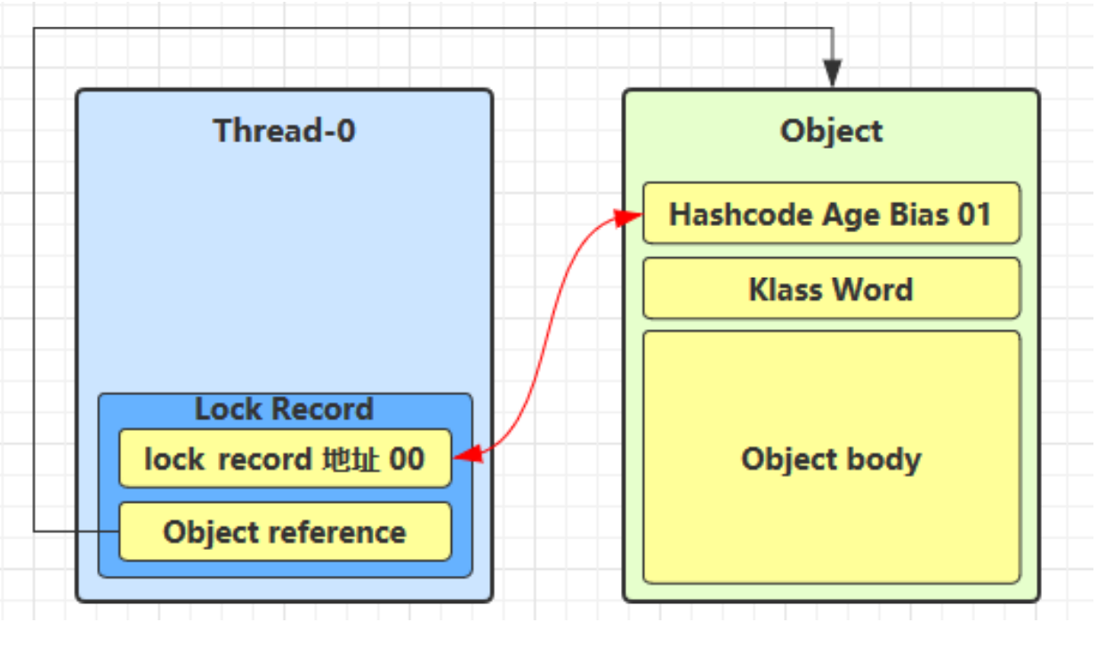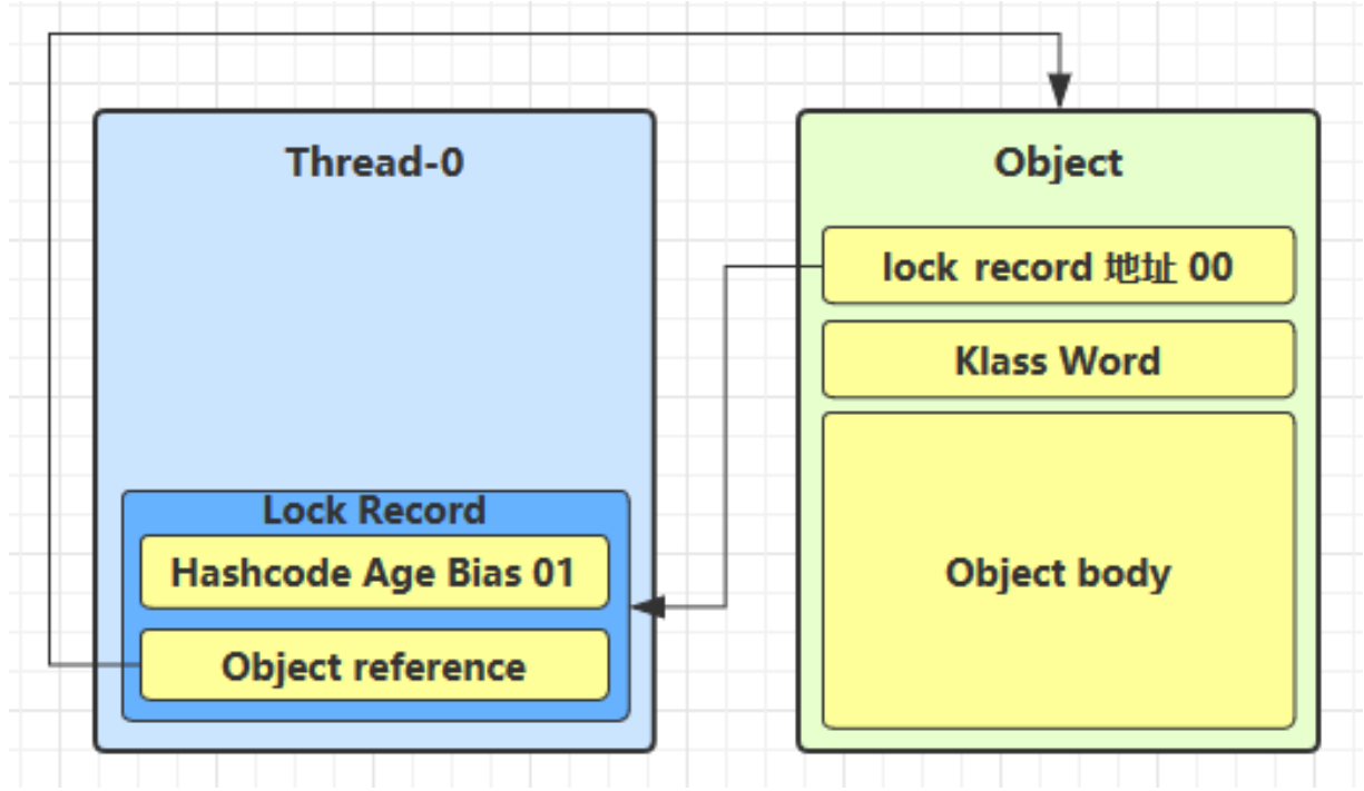 ③如果cas替换成功,对象头中存储了锁记录地址和状态00,表示由该线程给对象加轻量级锁,这时图示如下。