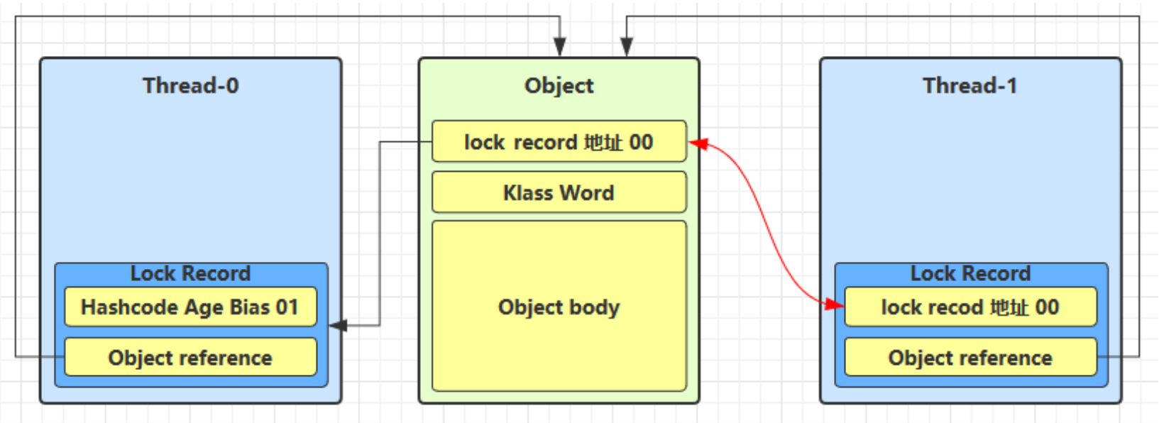 - 当Thread-1进行轻量级加锁时,Thread-0已经对该对象加了轻量级锁。