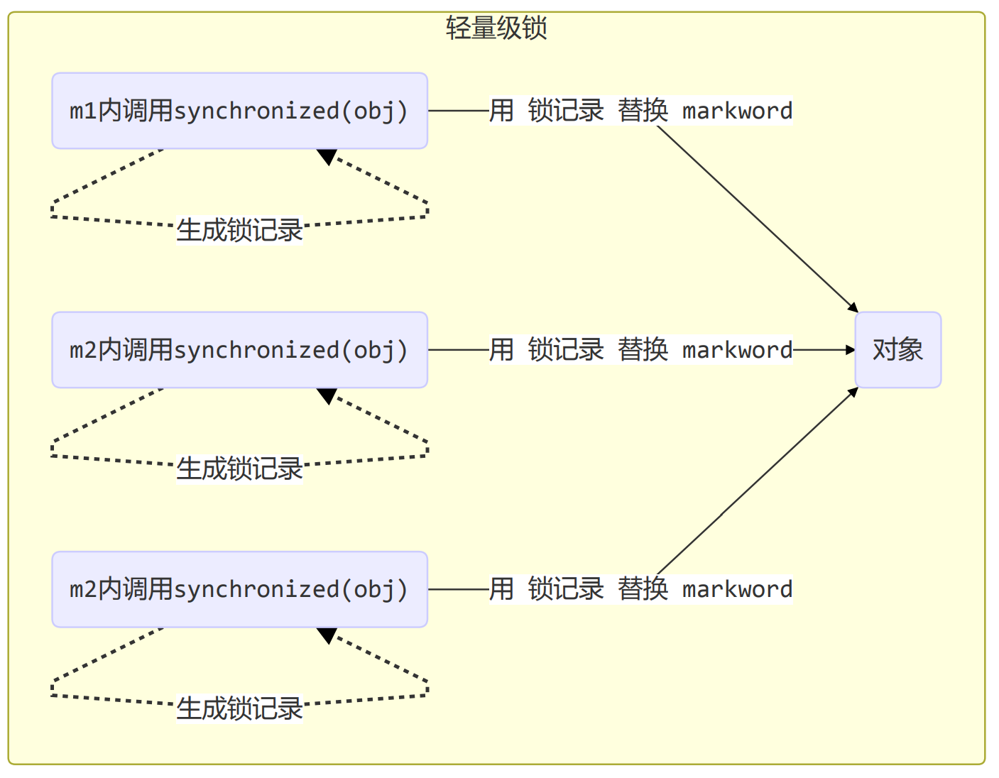 轻量级锁在没有竞争时(就自己这个线程),每次重入仍然需要执行CAS操作。