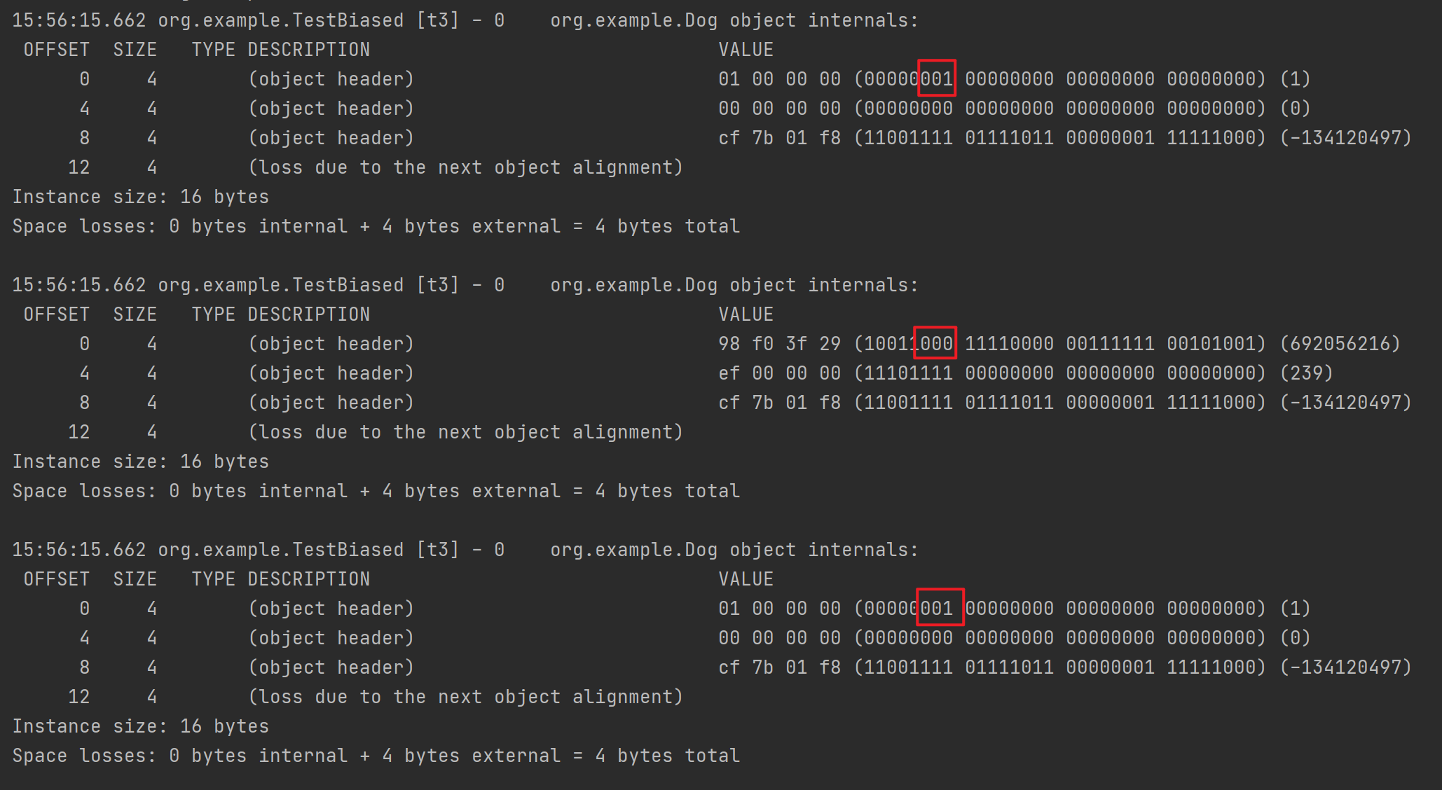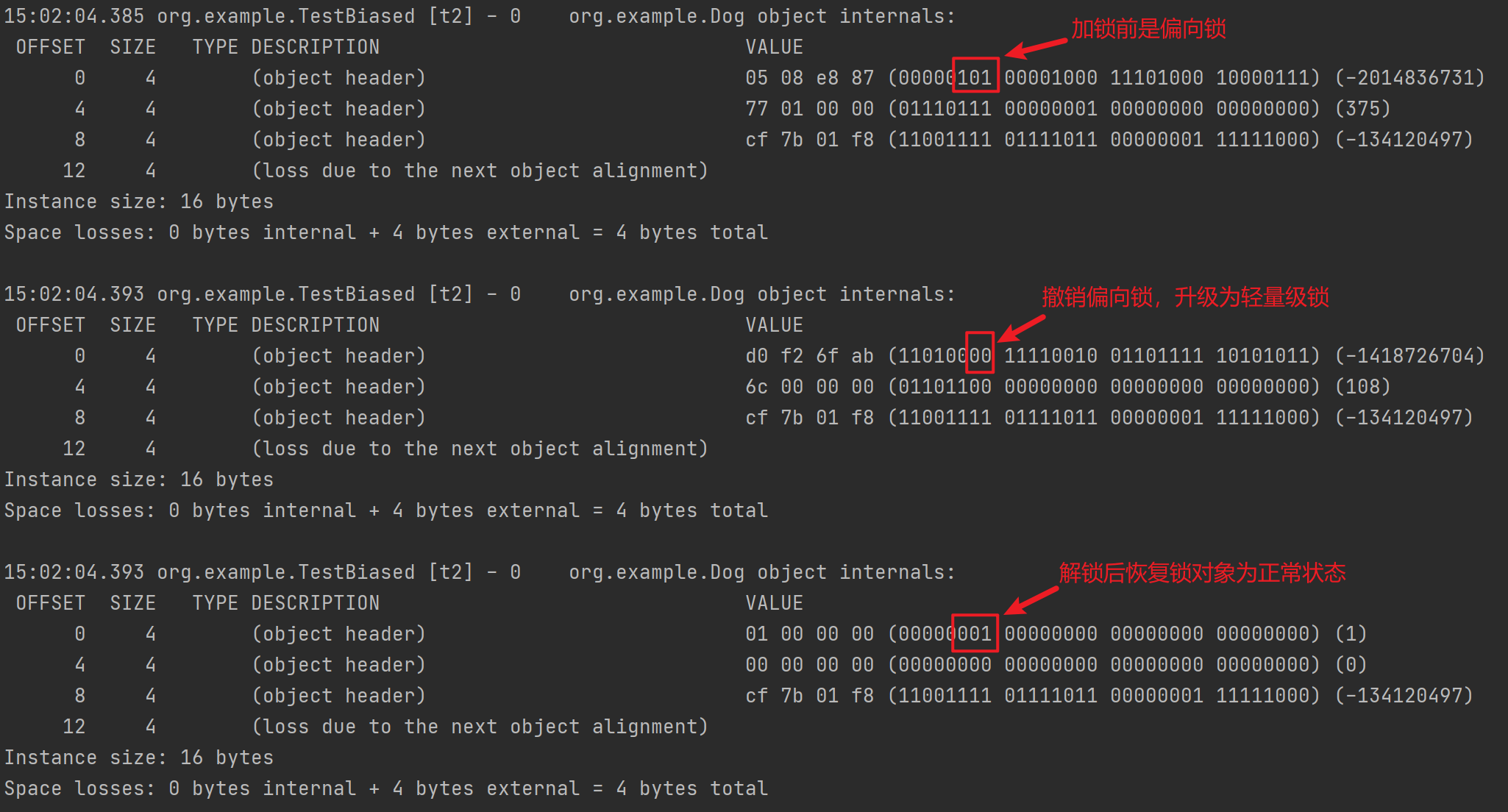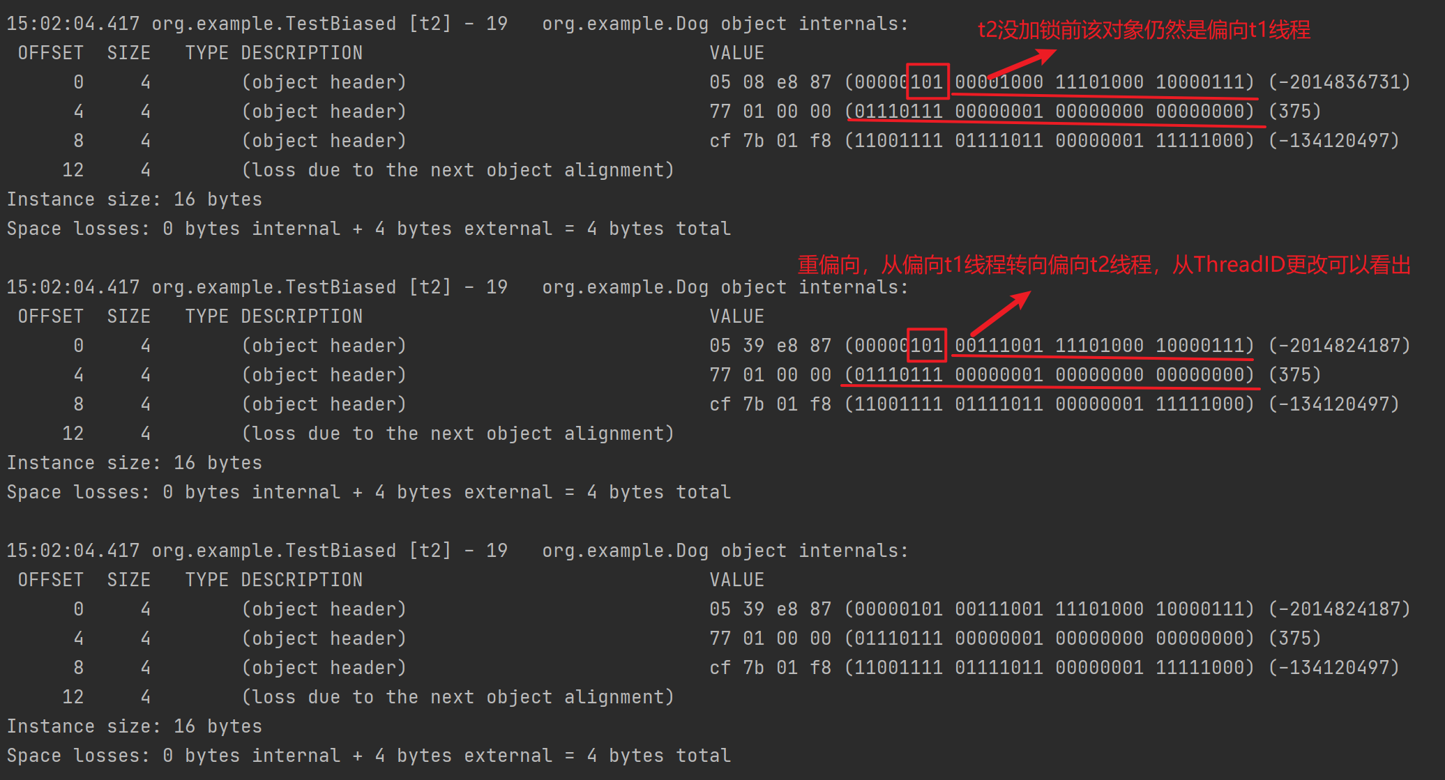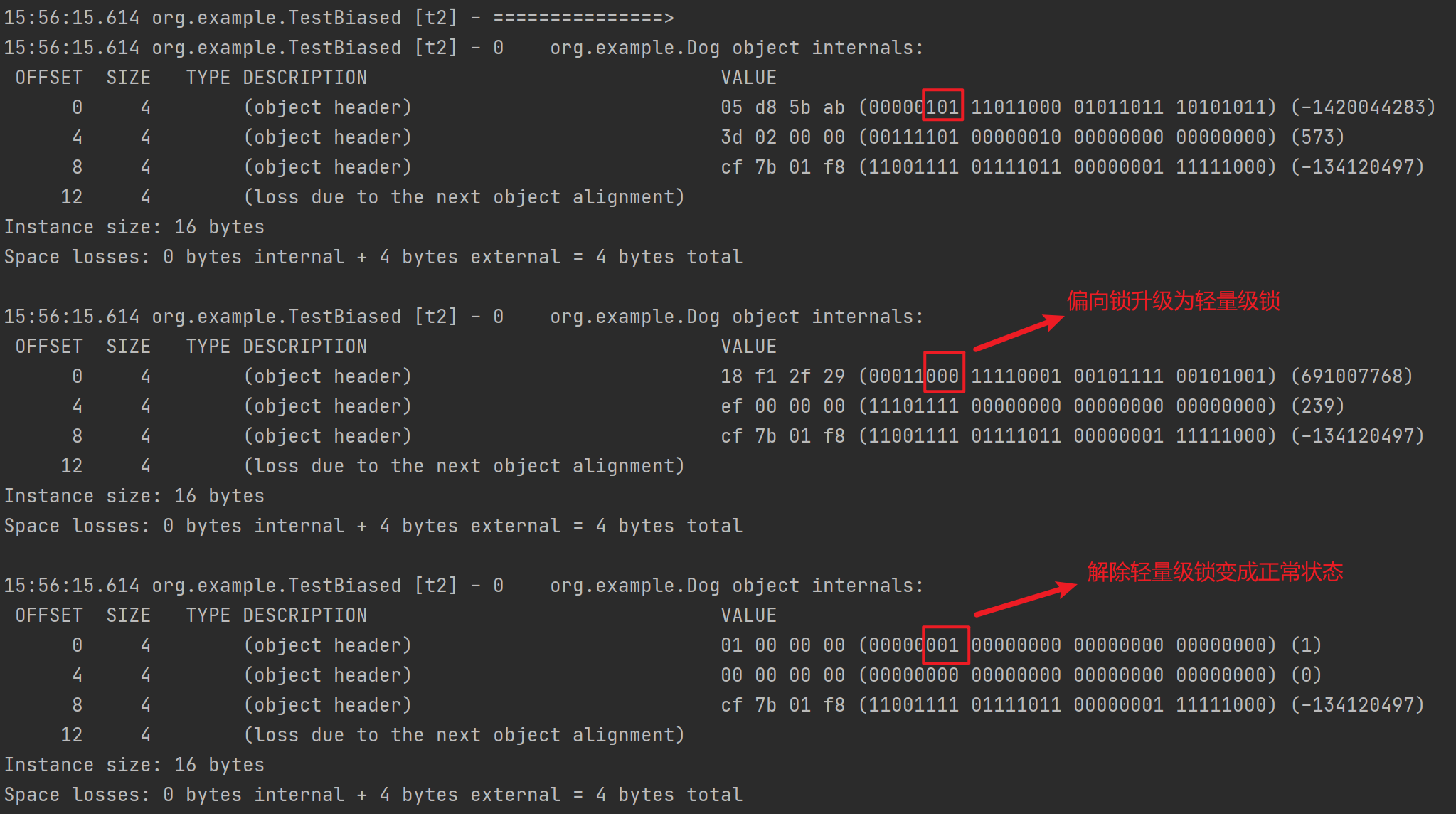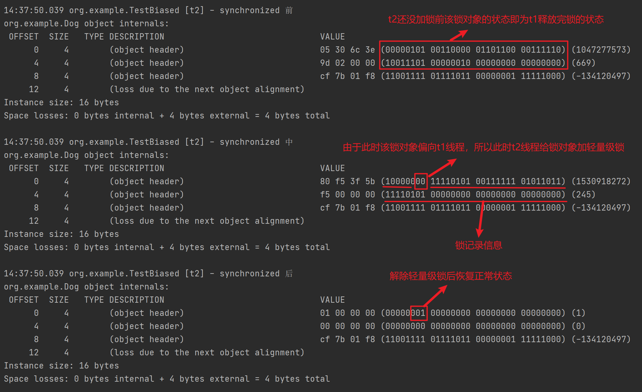 ⑤紧接着t3线程后面的第20至39次打印是将处于偏向锁状态的锁对象分别变成轻量级锁,并在解锁后变成正常状态。