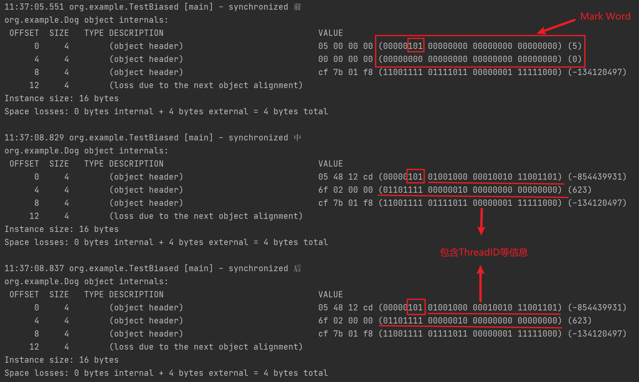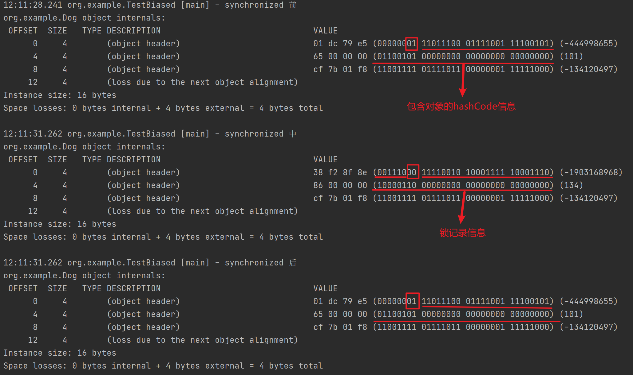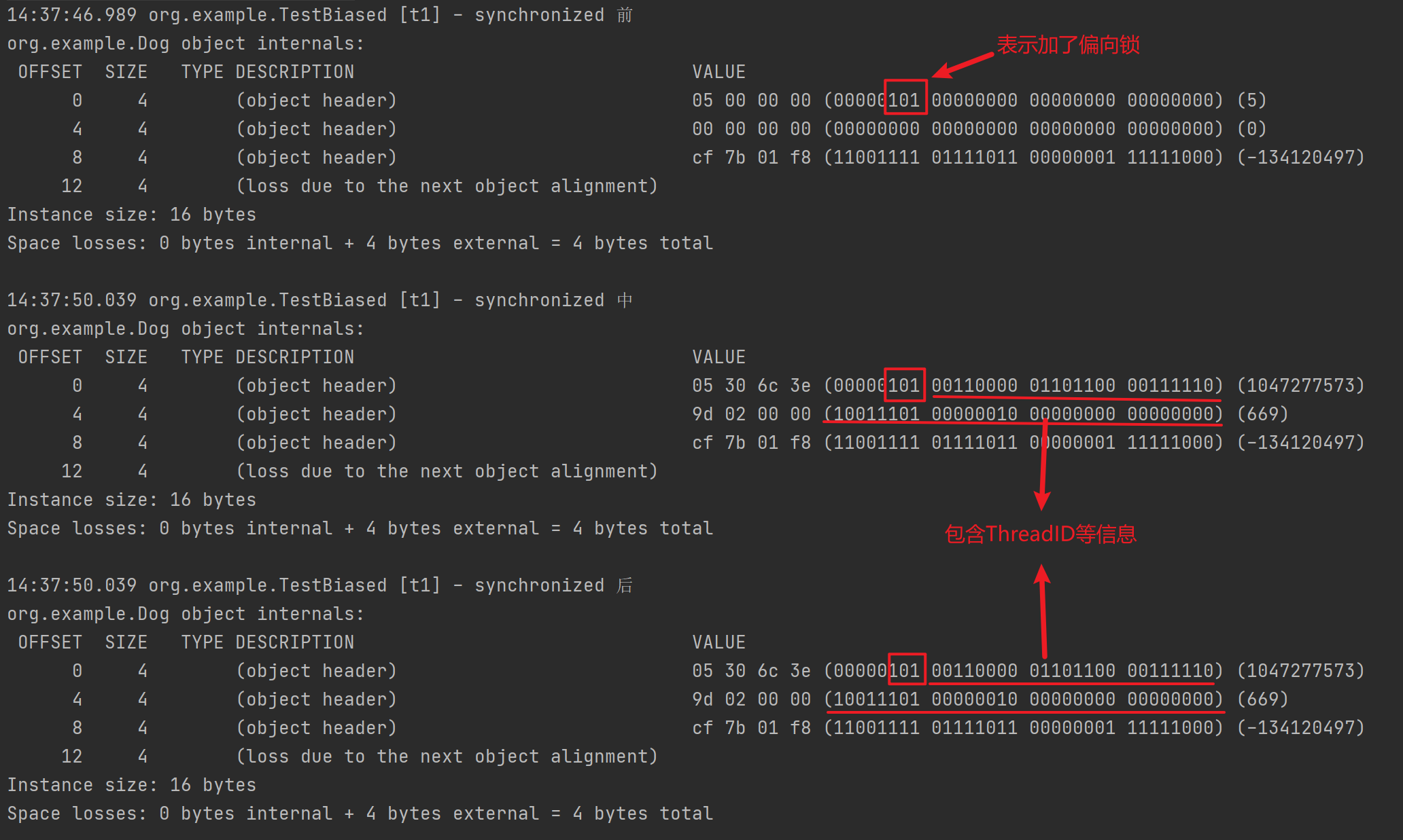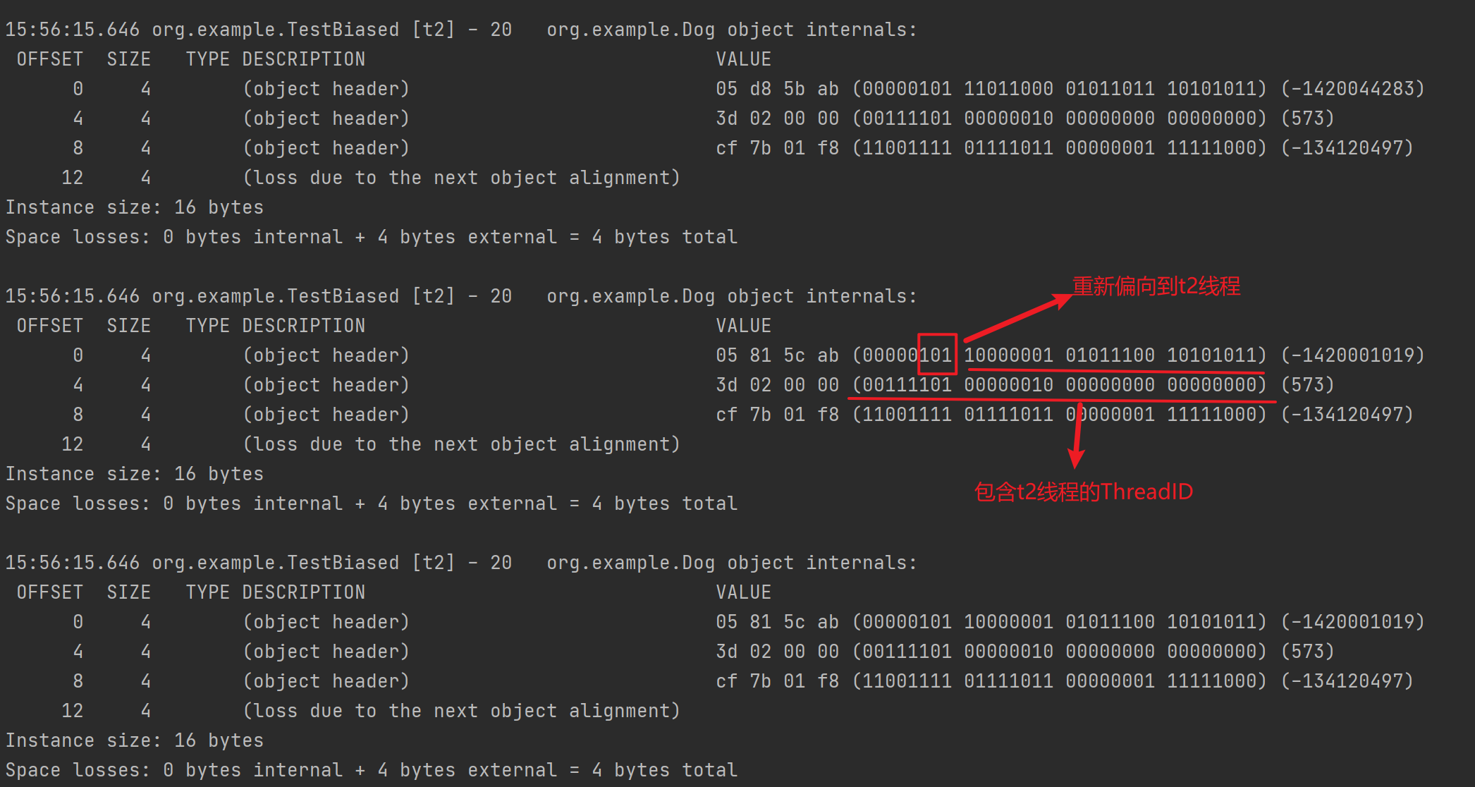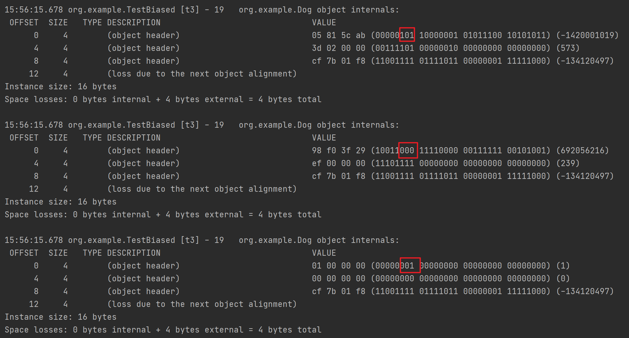 ⑤紧接着t3线程后面的第20至39次打印是将处于偏向锁状态的锁对象分别变成轻量级锁,并在解锁后变成正常状态。