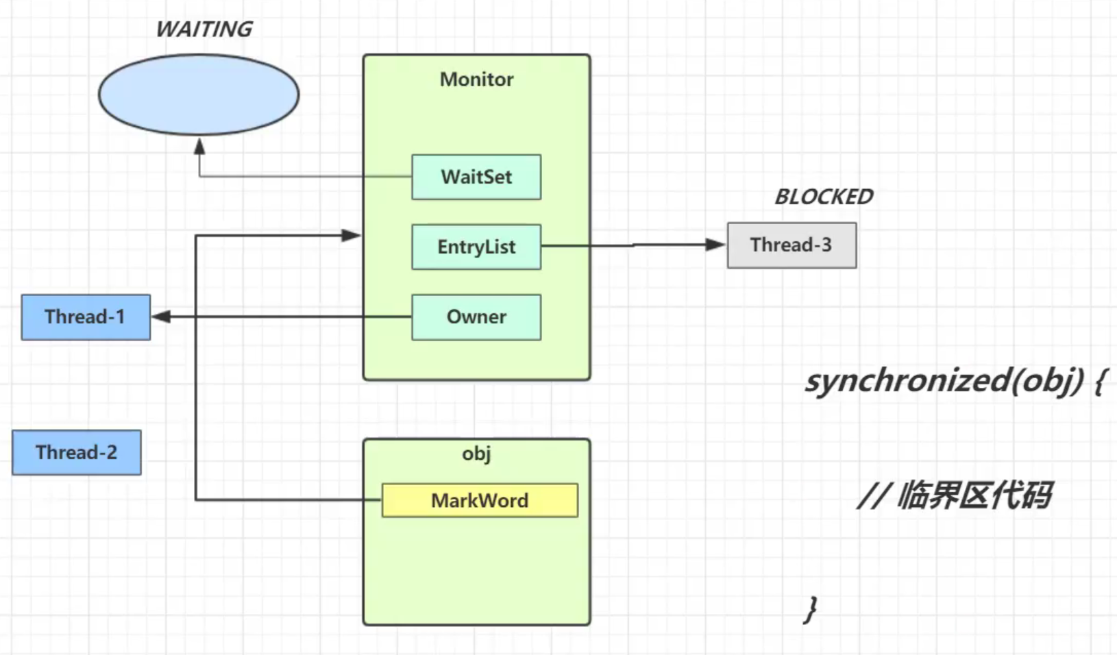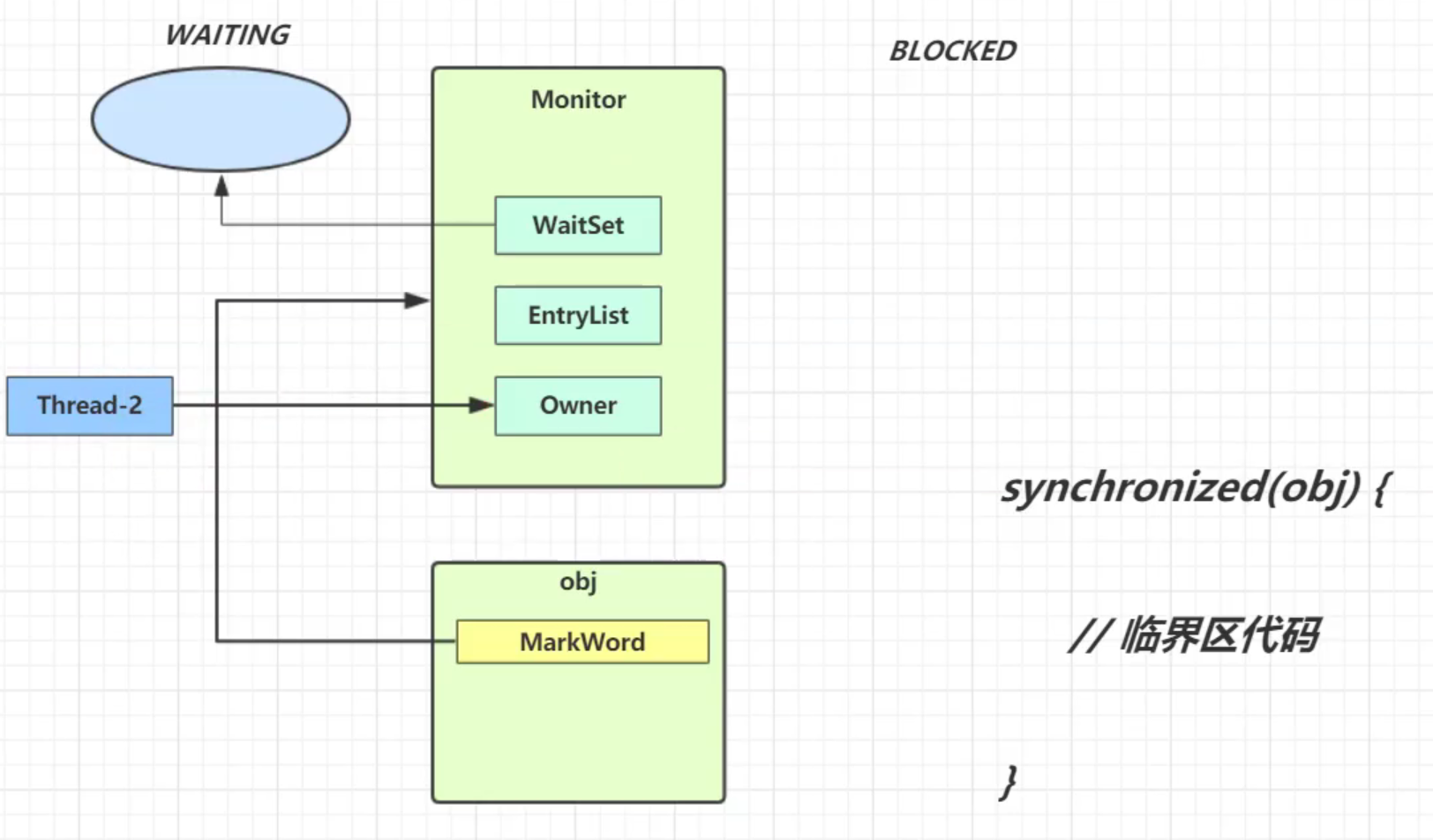 ③同理,如果紧接着Thread-3也来执行synchronized(obj),也会进入EntryList中阻塞,EntryList是一个链表结构。