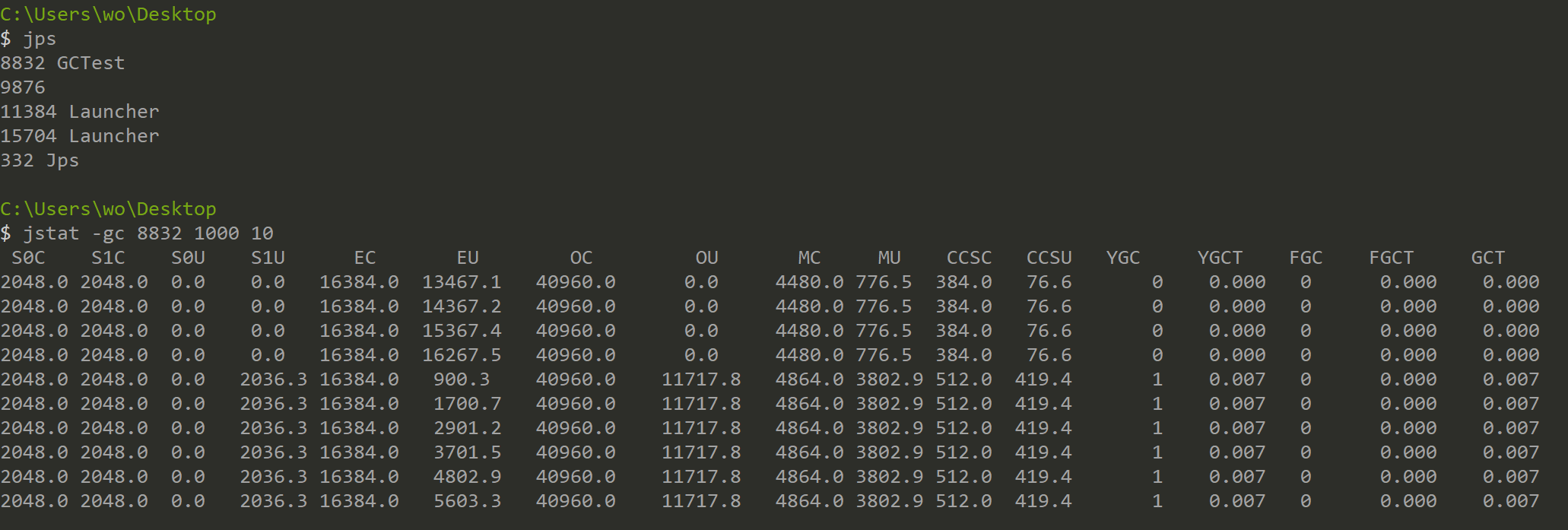 }-gc:显示与GC相关的堆信息。包括Eden区、两个Survivor区、老年代、永久代等的容量、已用空间、GC时间合计等信息。运行程序后测试结果如下:
