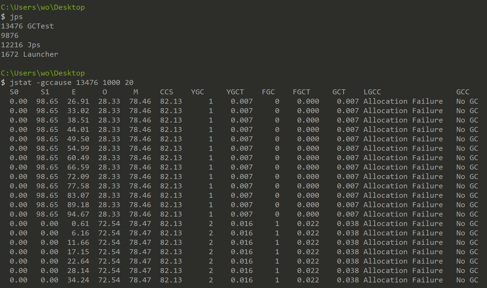 -gccause:与-gcutil功能一样,但是会额外输出导致最后一次或当前正在发生的GC产生的原因。运行程序后测试结果如下: