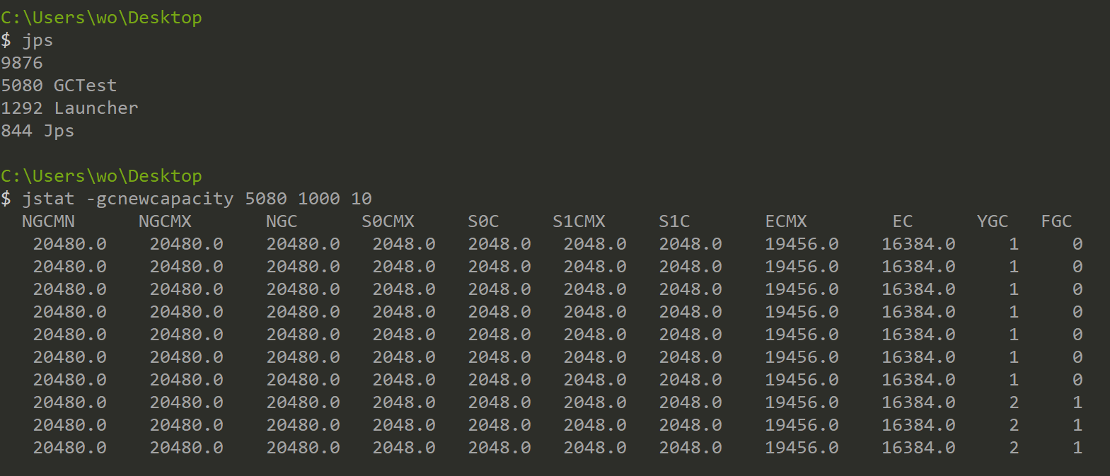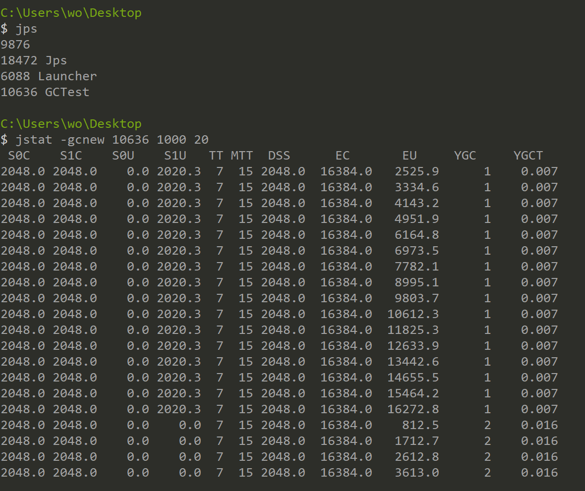 -gcnew:显示新生代GC状况。运行程序后测试结果如下: