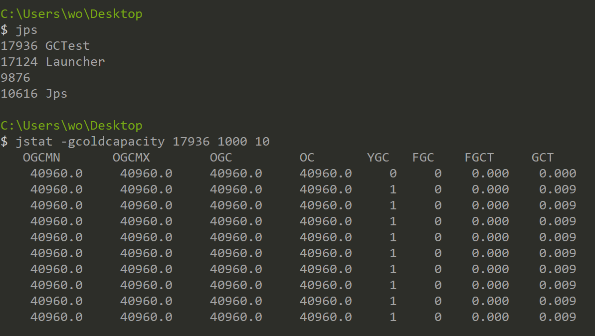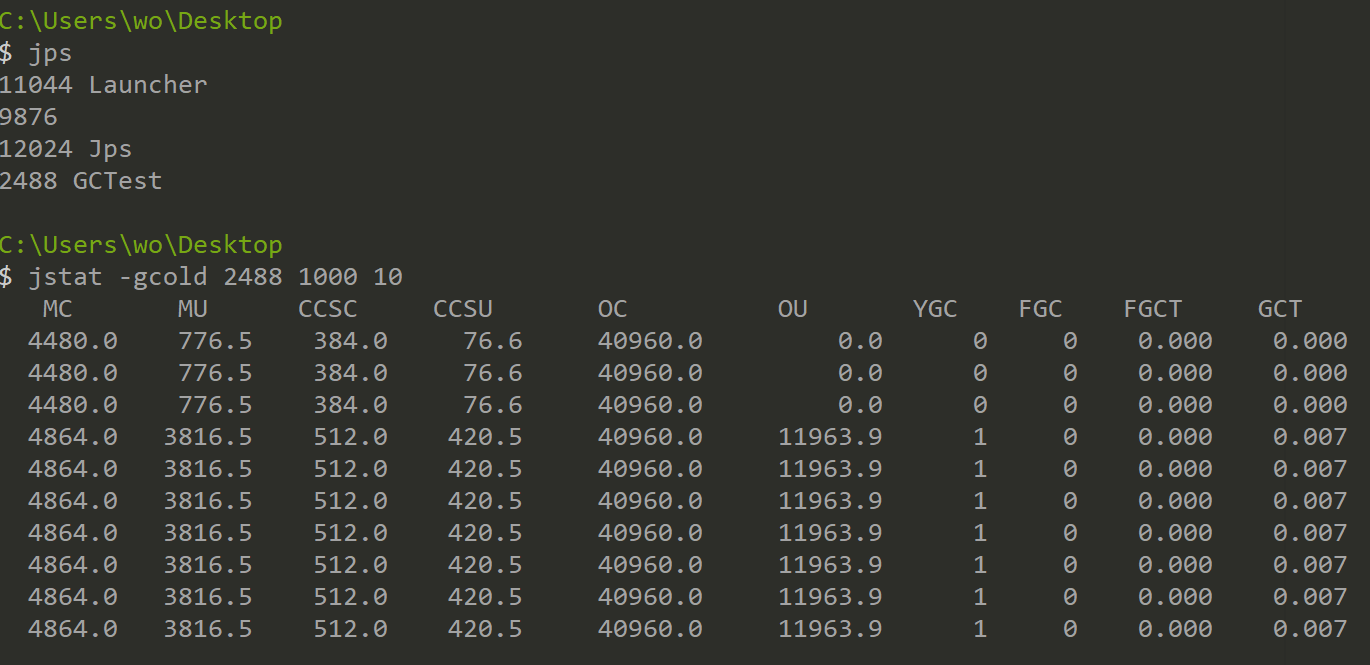-gcold:显示老年代GC状况。运行程序后测试结果如下: