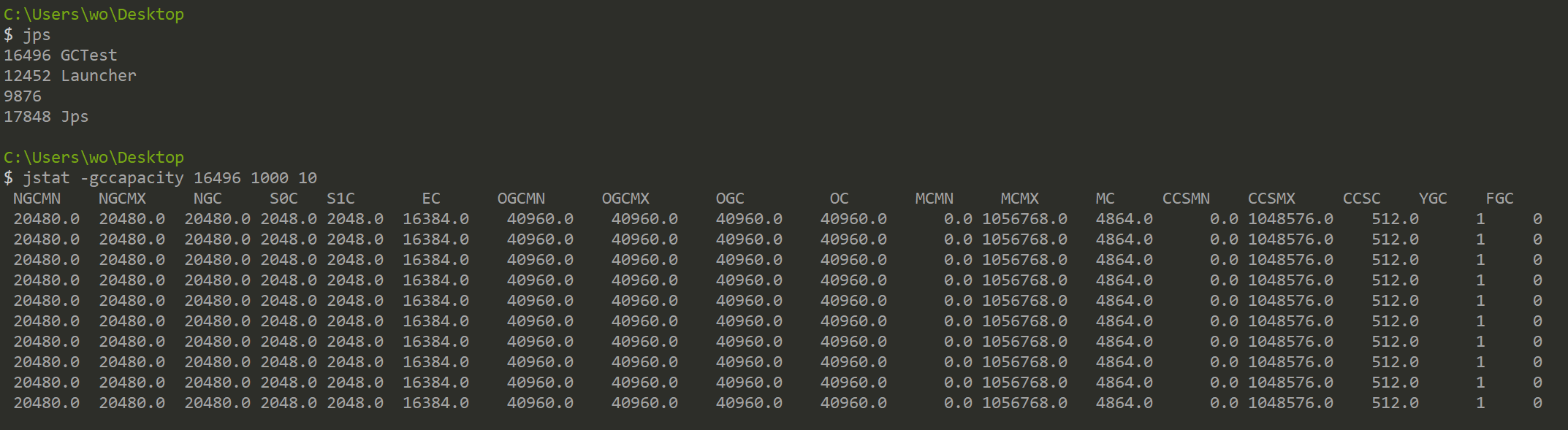 -gcoldcapacity:显示内容与-gcold基本相同,输出主要关注使用到的最大、最小空间。运行程序后测试结果如下: