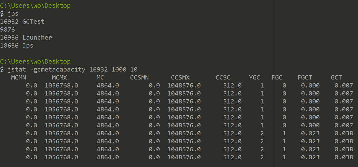-gcmetacapacity: 显示metaspace的大小。运行程序后测试结果如下: