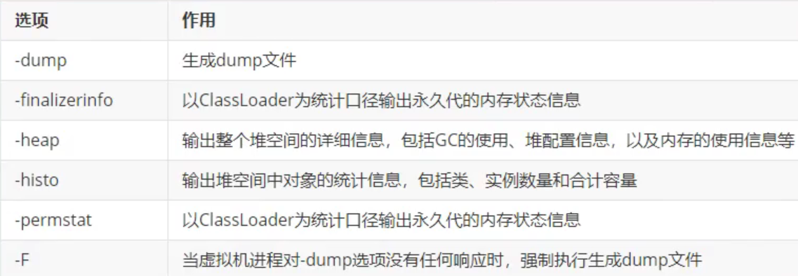 jmap(JVM Memory Map):作用一方面是获取dump文件(堆转储快照文件,二进制文件),它还可以获取目标Java进程的内存相关信息,包括Java堆各区域的使用情况、堆中对象的统计信息、类加载信息等。