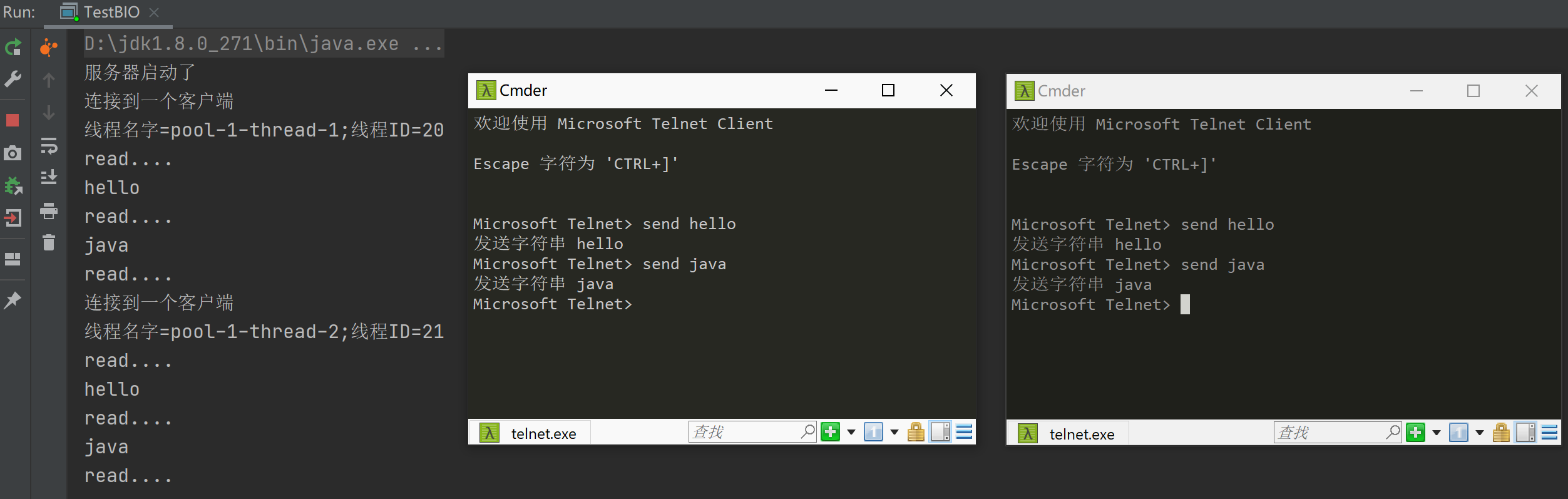 服务器端可以接收客户端发送的数据(telnet方式即可)。