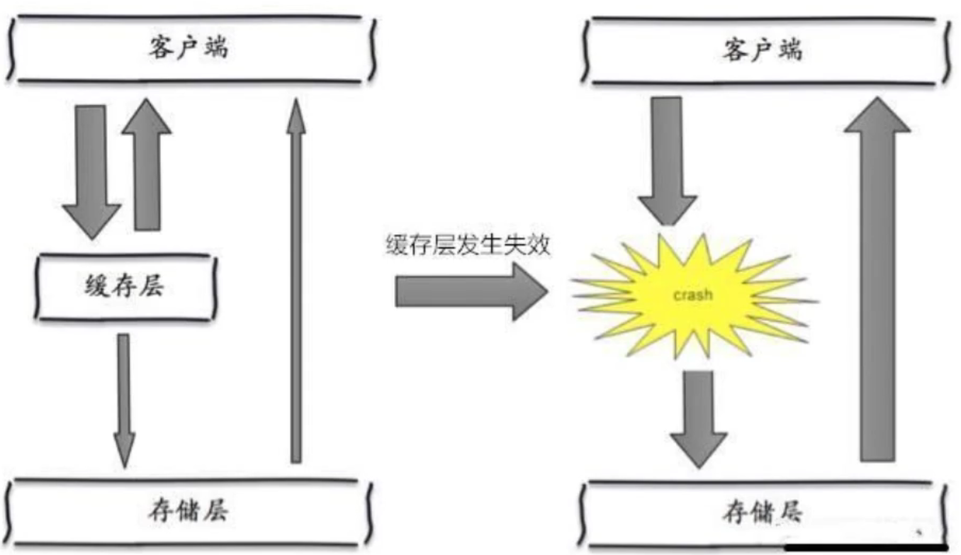 产生雪崩的原因之一,比如在写本文的时候,马上就要到双十二零点,很快就会迎来一波抢购,这波商品时间比较集中的放入了缓存,假设缓存一个小时。那么到了凌晨一点钟的时候,这批商品的缓存就都过期了。而对这批商品的访问查询,都落到了数据库上,对于数据库而言,就会产生周期性的压力波峰。于是所有的请求都会达到存储层,存储层的调用量会暴增,造成存储层也会挂掉的情况。