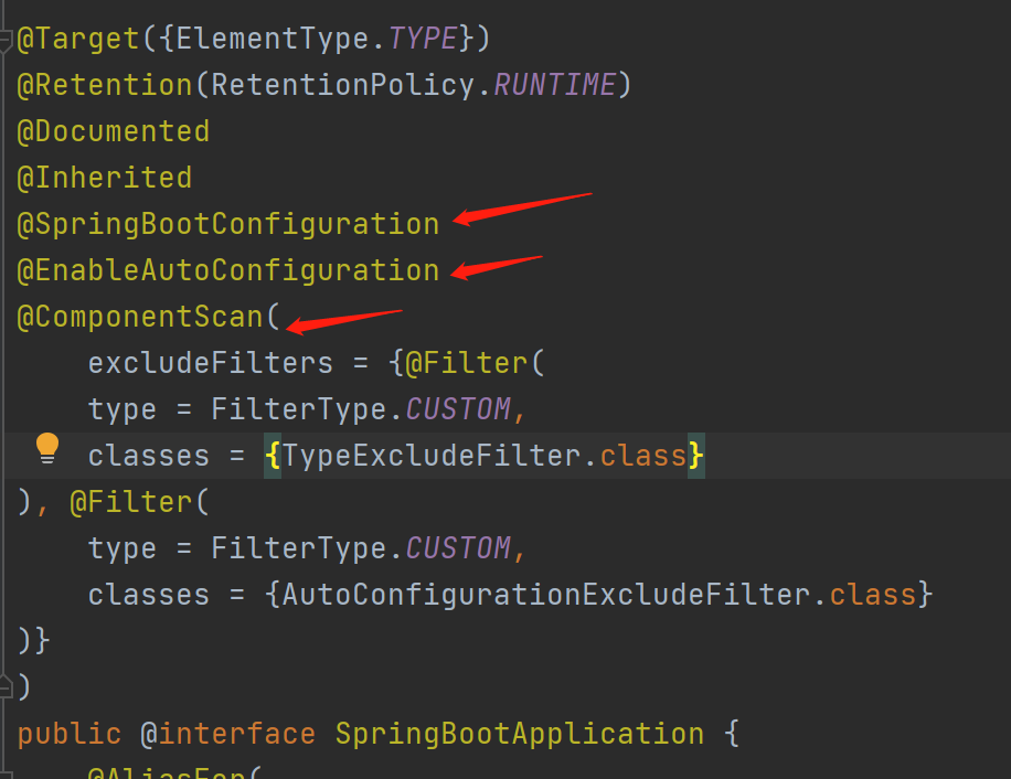 - Spring Boot项目的启动注解是:@SpringBootApplication,其实它就是由下面三个注解组成的: