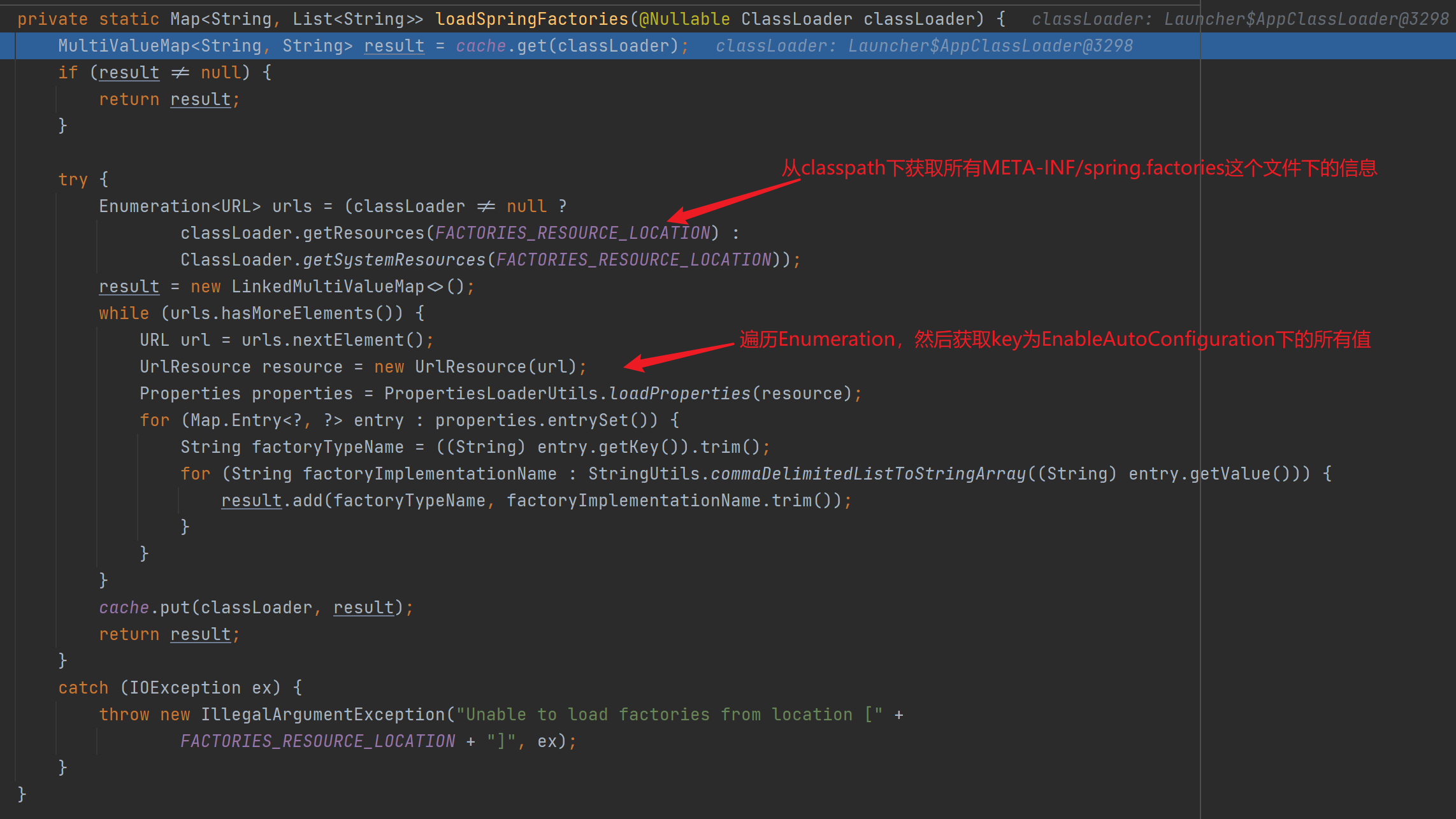 getCandidateConfigurations()会调用SpringFactoriesLoader.loadFactoryNames()–>loadSpringFactories()查找classpath上所有jar包中的META-INF/spring.factories进行加载,从而得到各个组件。