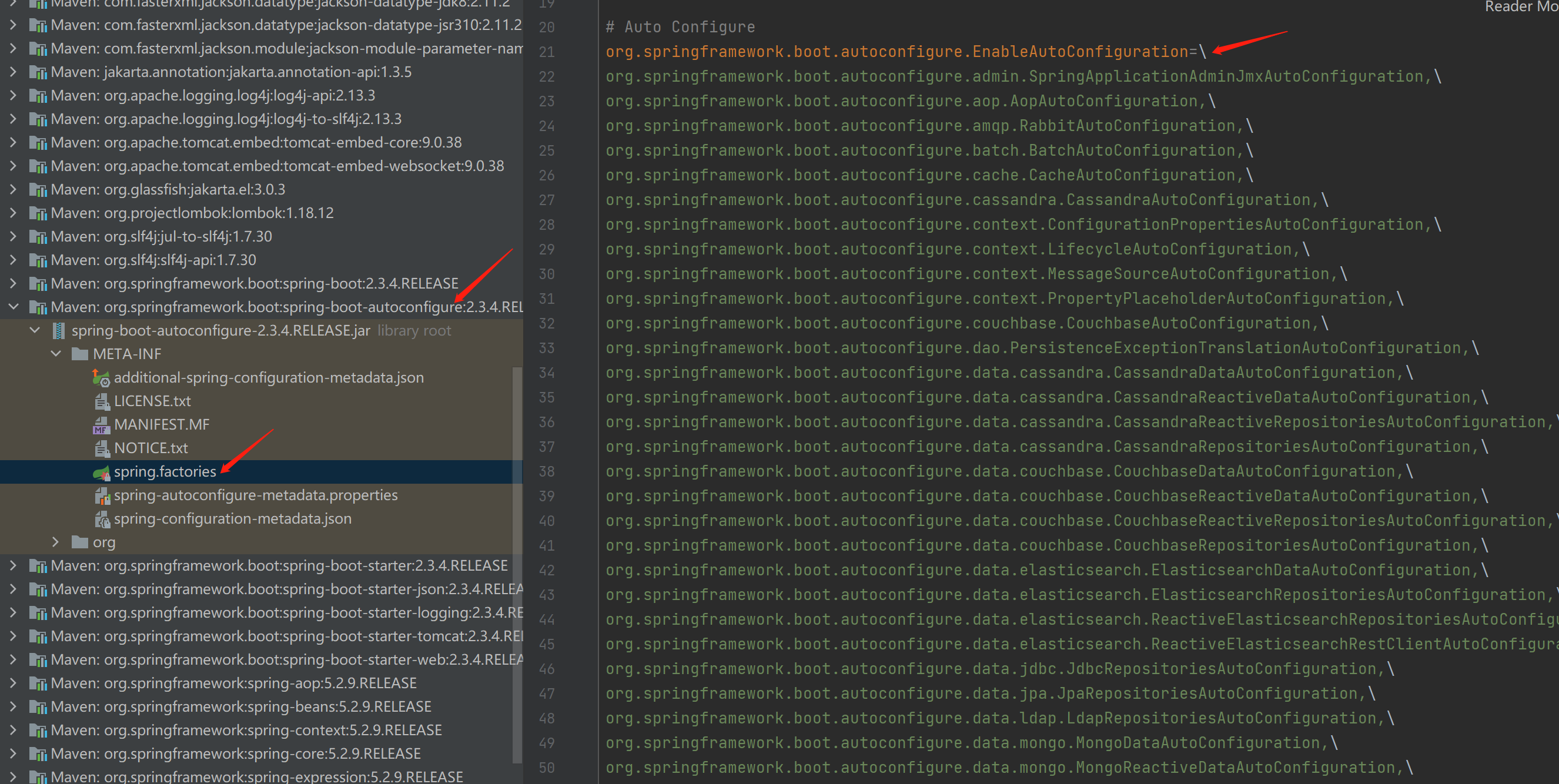 以spring-boot-autoconfigure-2.3.4.RELEASE.jar包里面的META-INF/spring.factories为例: