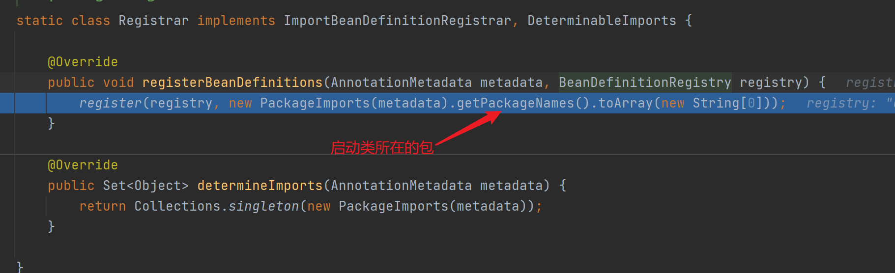 - @AutoConfigurationPackage:将Registrar类导入到容器中,而Registrar类作用是扫描主配置类同级目录以及子包,并将相应的组件导入到springboot创建管理的容器中。