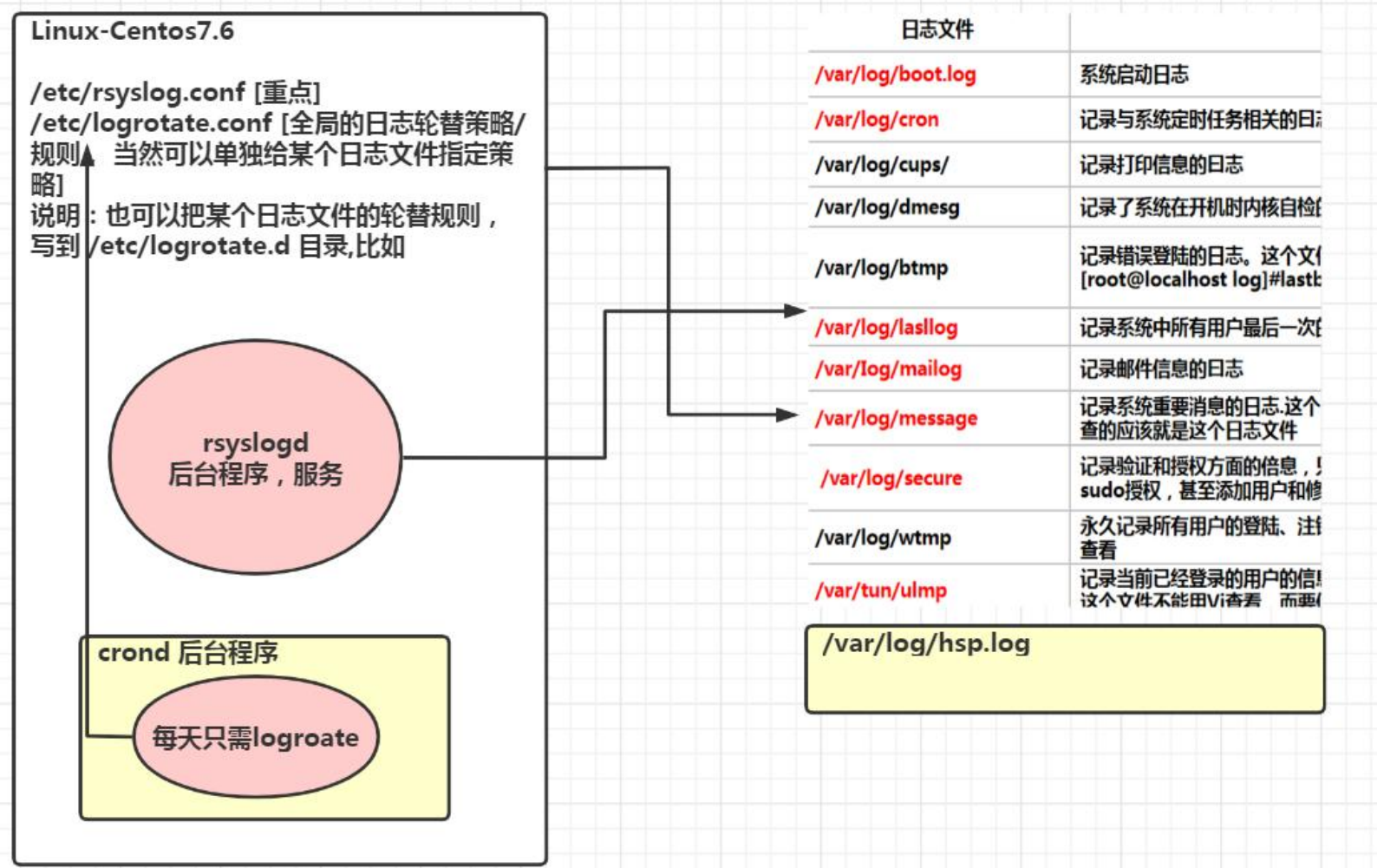 CentOS7.6日志服务是rsyslogd,CentOS6.x日志服务是syslogd。rsyslogd 功能更强大。rsyslogd的使用、日志文件的格式,和syslogd服务是兼容的。原理示意图: