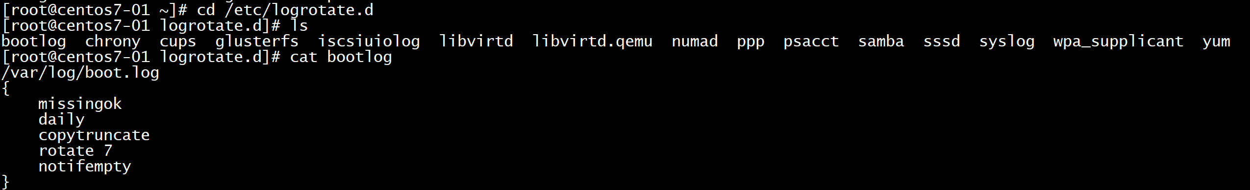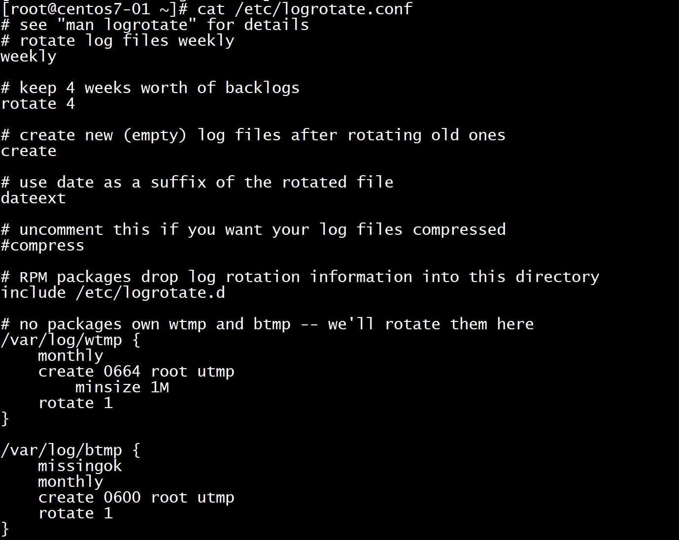 include /etc/logrotate.d # 包含/etc/logrotate.d/目录中所有的子配置文件,也就是说会把这个目录中所有子配置文件读取进来,例如boot.log