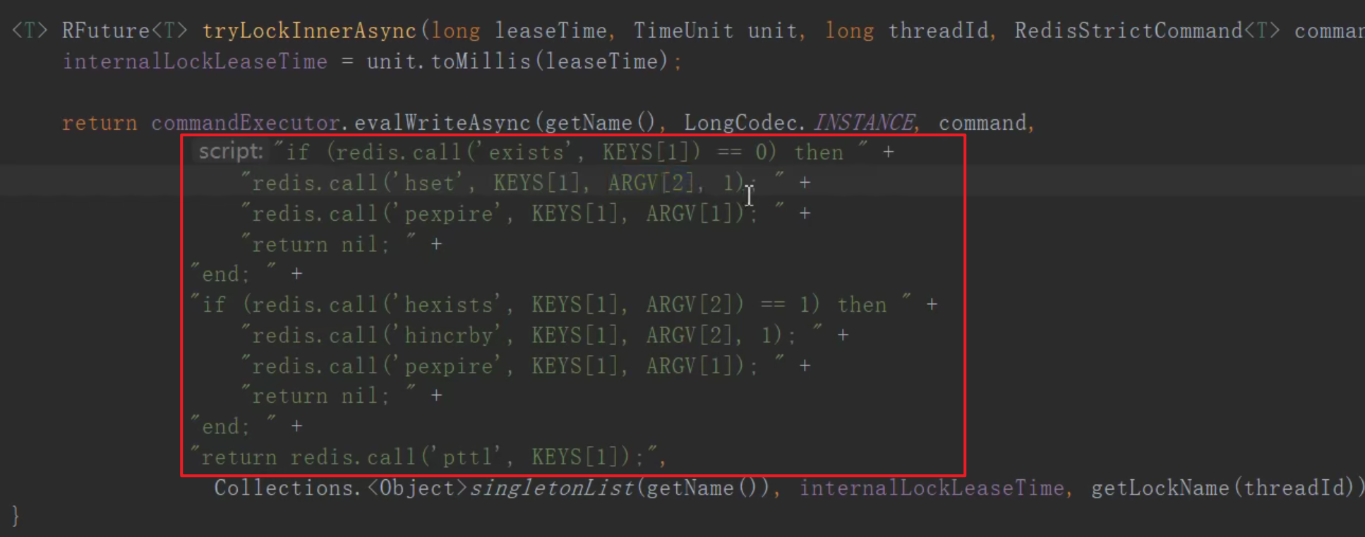 Object result = jedis.eval(script, Collections.singletonList(REDIS_LOCK_KEY), Collections.singletonList(value));