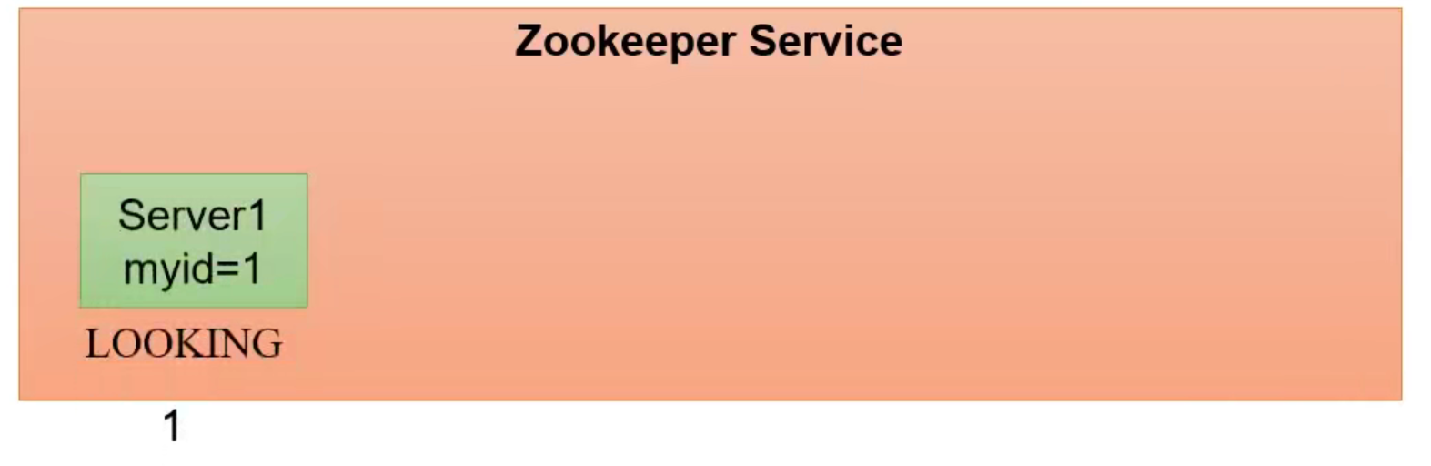 ①服务器1启动,发起一次选举。服务器1投自己一票。此时服务器1票数一票,不够半数以上(3票),选举无法完成,服务器1状态保持为LOOKING。