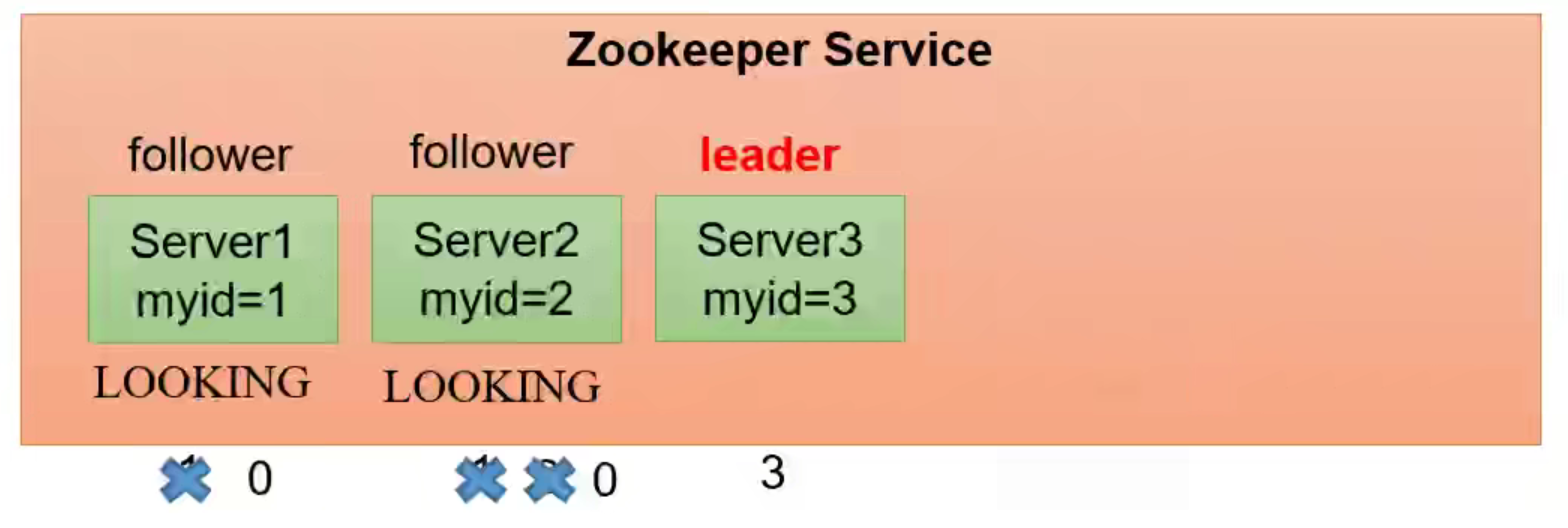 ③服务器3启动,发起一次选举。此时服务器1和2都会更改选票为服务器3。此次投票结果:服务器1为0票,服务器2为0票,服务器3为3票。此时服务器3的票数已经超过半数,服务器3当选Leader。服务器1,2更改状态为FOLLOWING,服务器3更改状态为LEADING。