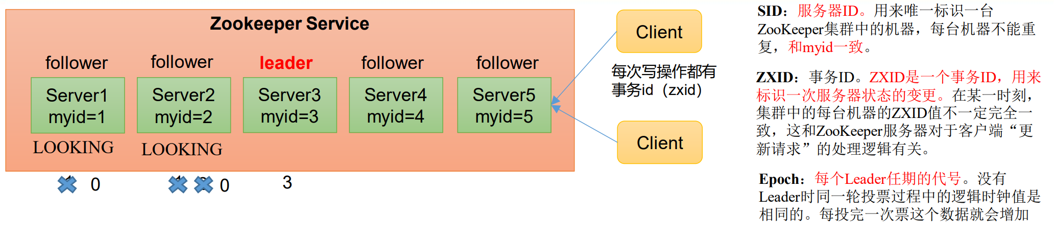 假设ZooKeeper由5台服务器组成,SID分别为1、2、3、4、5,ZXID分别为8、8、8、7、7,并且此时SID为3的服务器是Leader。某一时刻, 3和5服务器出现故障,因此开始进行Leader选举。