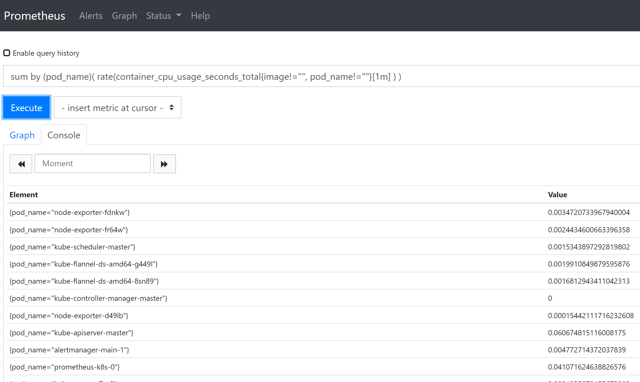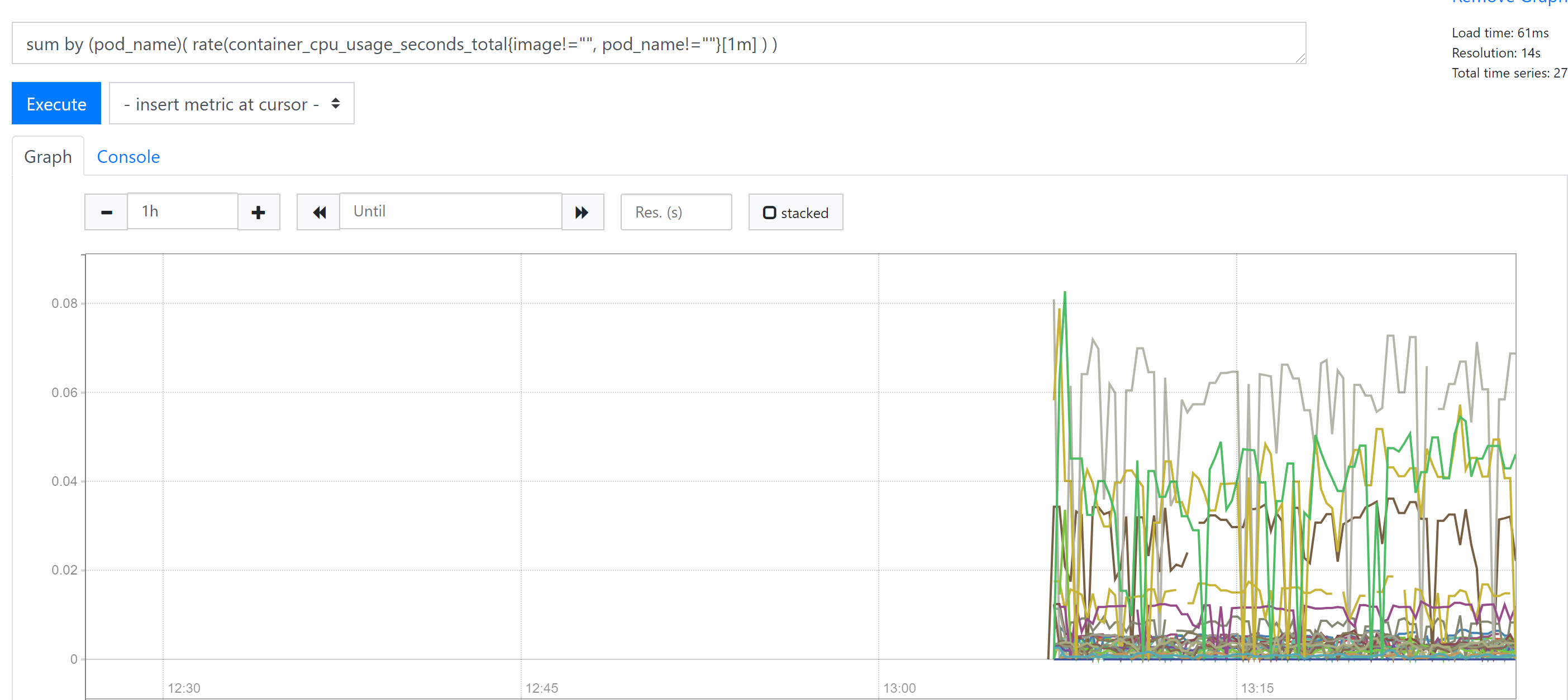 sum by (pod_name)( rate(container_cpu_usage_seconds_total{image!="", pod_name!=""}[1m] ) )