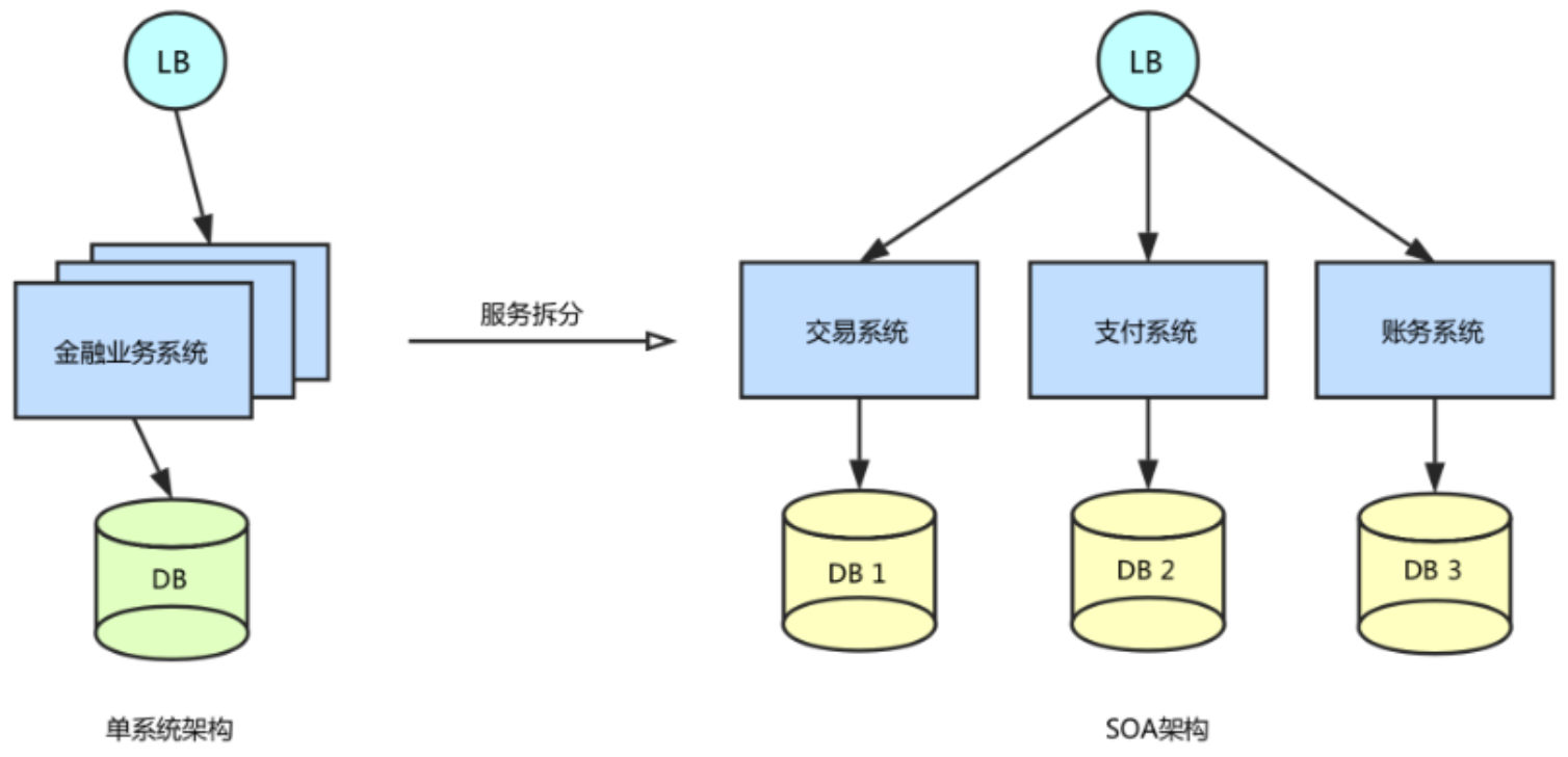 如下图所示,按照面向服务(SOA)的架构的设计原则,将单业务系统拆分成多个业务系统,降低了各系统之间的耦合度,使不同的业务系统专注于自身业务,更有利于业务的发展和系统容量的伸缩。