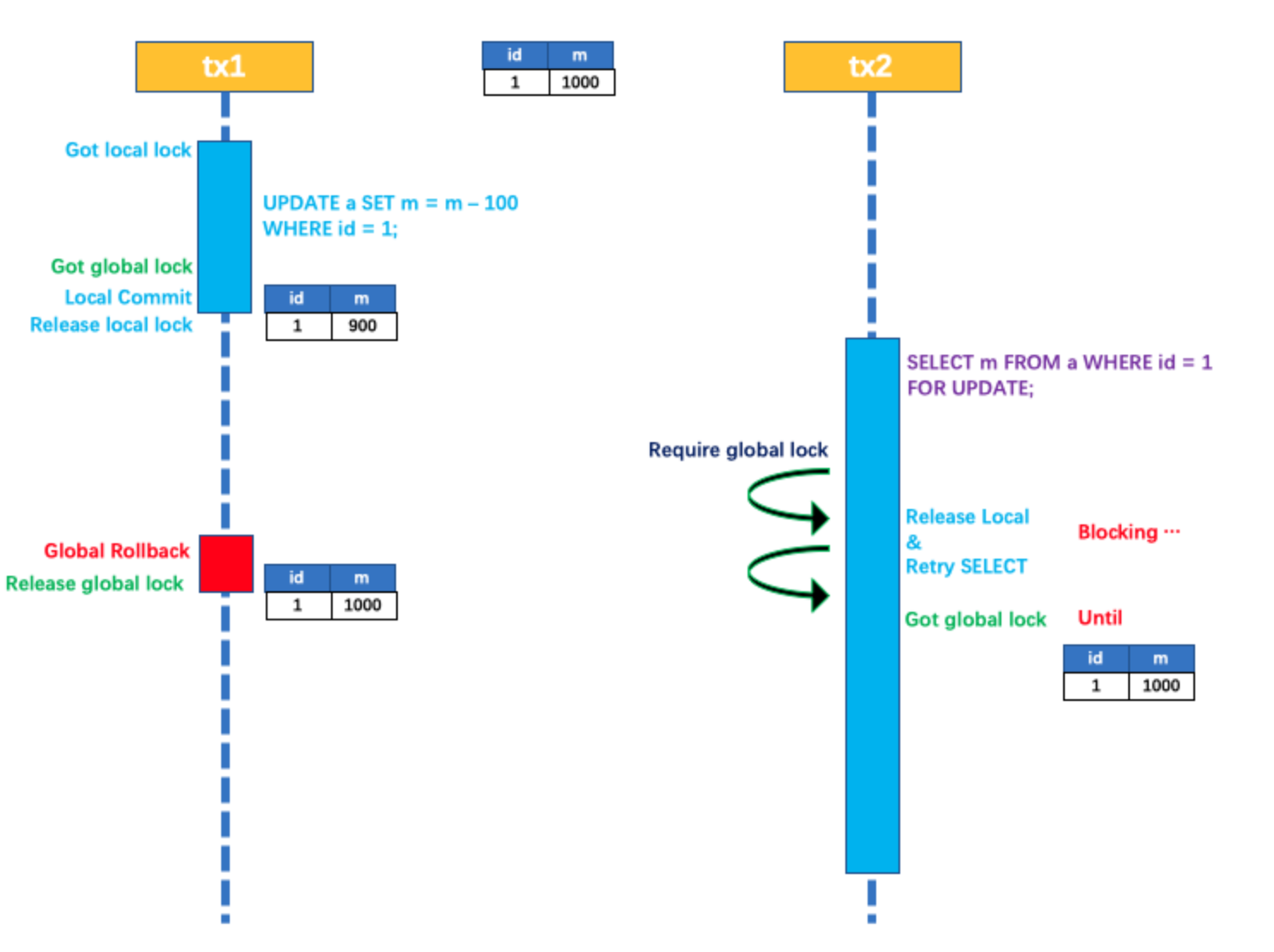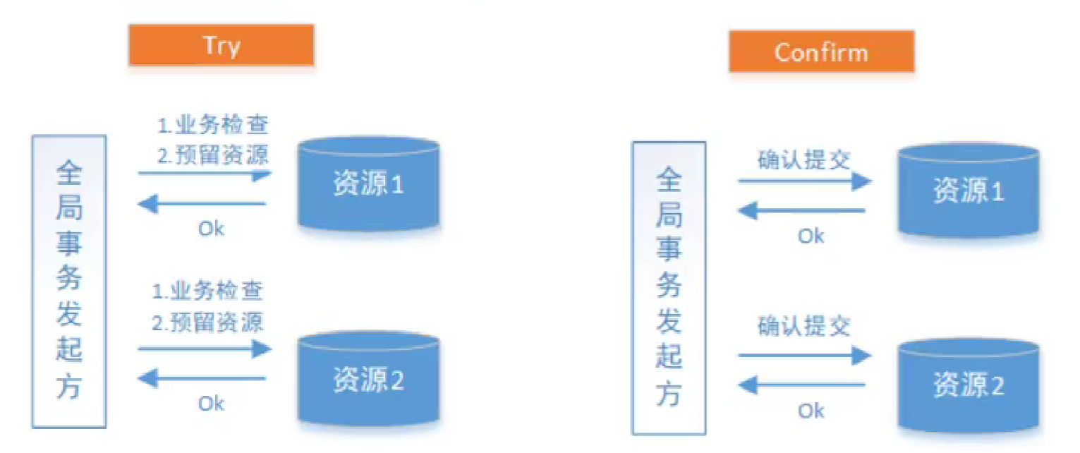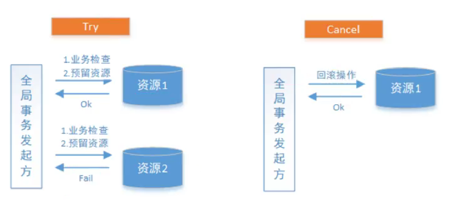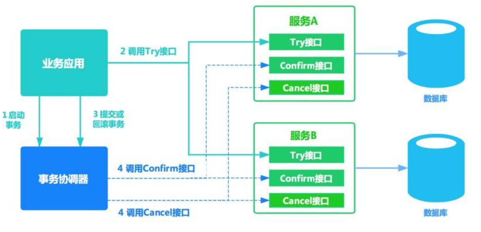 - 而不足之处则在于对应用的侵入性非常强,业务逻辑的每个分支都需要实现try、confirm、cancel三个操作。此外,其实现难度也比较大,需要按照网络状态、系统故障等不同的失败原因实现不同的回滚策略。