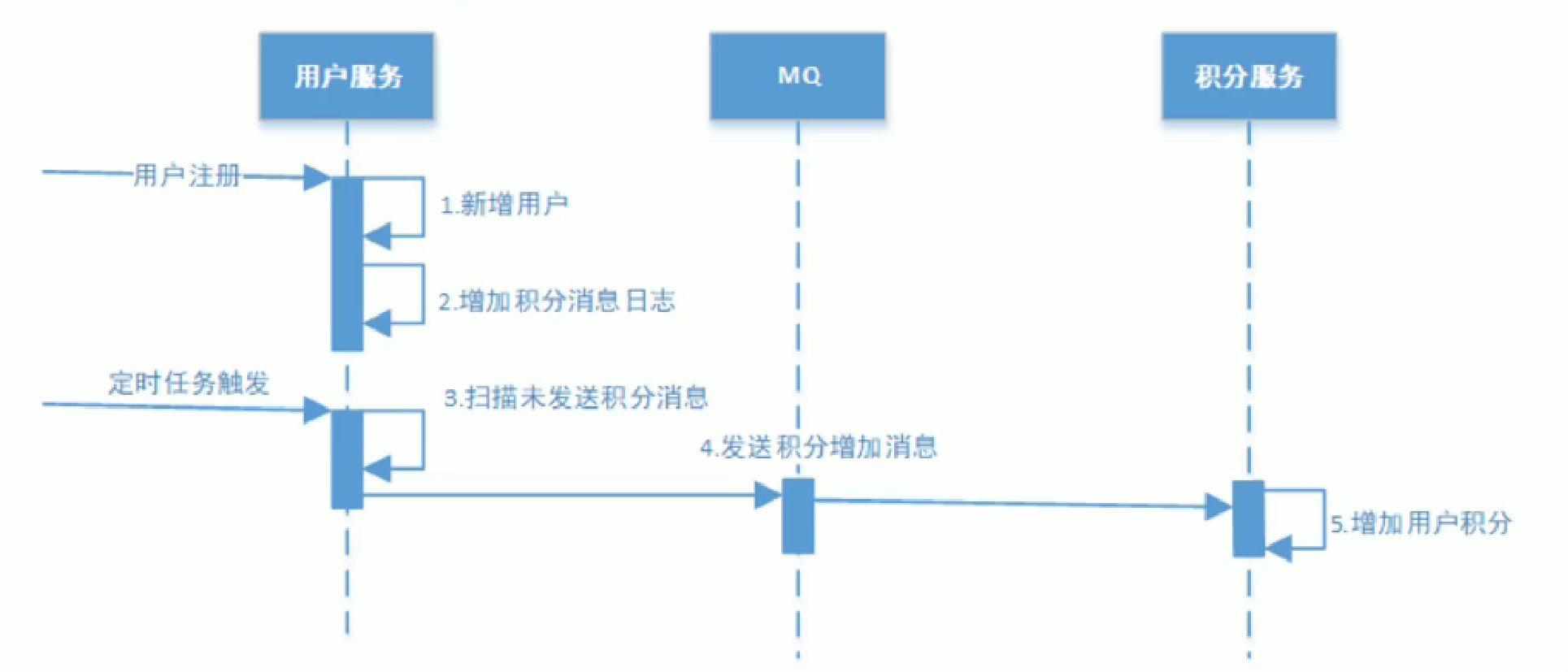 - 积分服务接收到”增加积分”消息,开始增加积分,积分增加成功后向消息中间件回应ack,否则消息中间件将重复投递此消息。由于消息可能会重复投递,积分服务的”增加积分”功能需要实现幂等性。