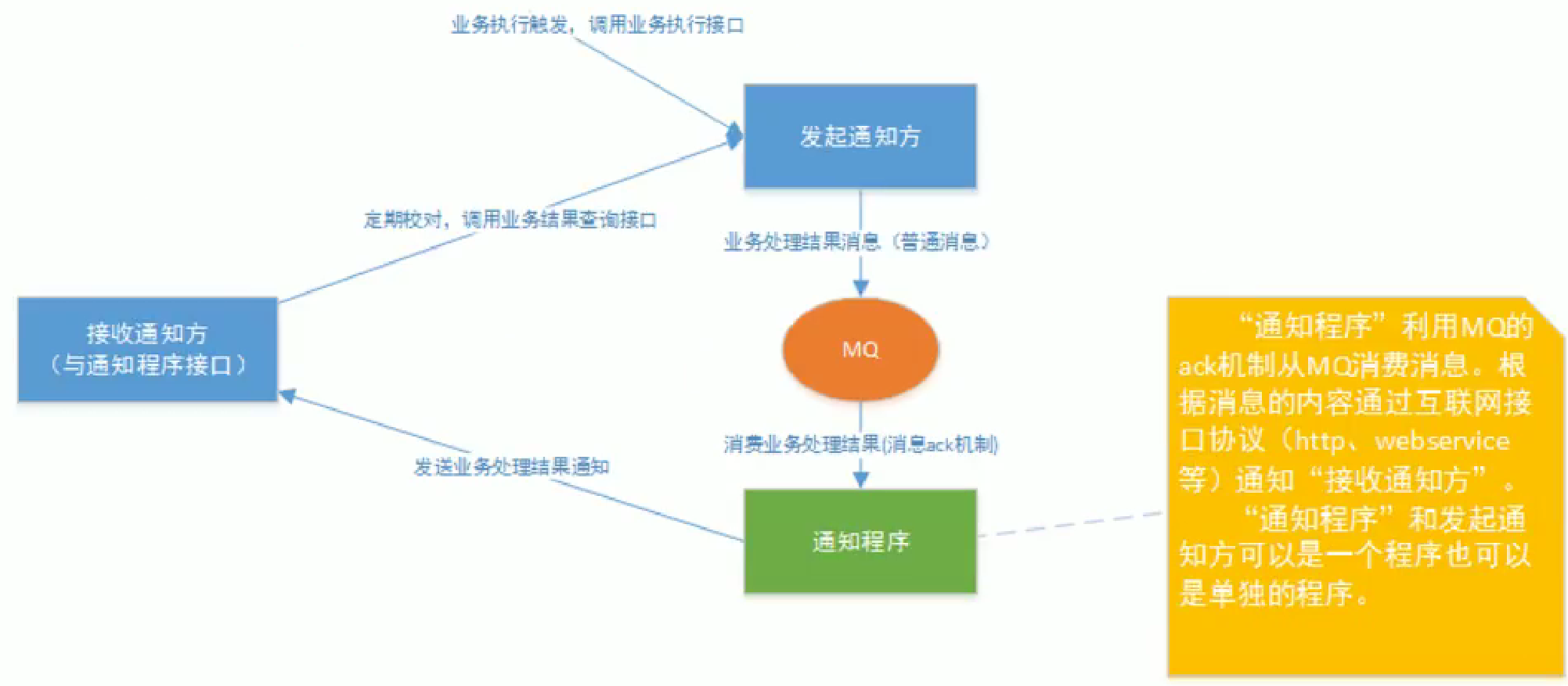 - 发起通知方将通知发给MQ,如果消息没有发出去可由接收通知方主动请求发起通知方查询业务执行结果。