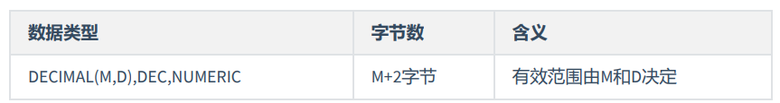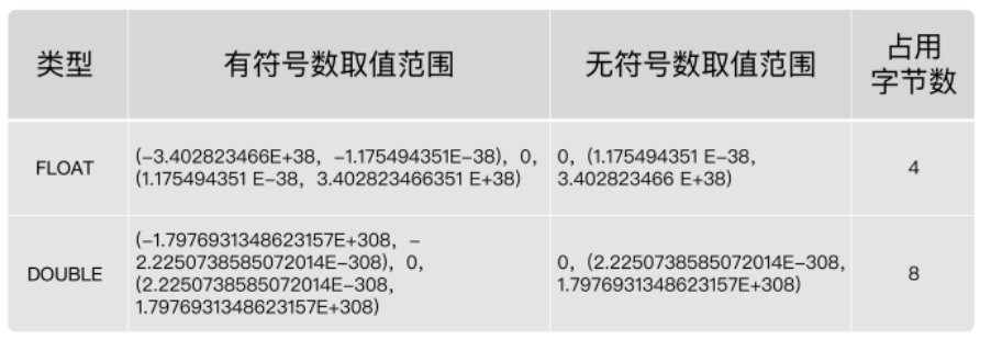 - 说明:在存储的时候,FLOAT和DOUBLE都存在精度损失的问题,很可能在比较值的时候,得到不正确的结果。如果存储的数据范围超过 DECIMAL 的范围,建议将数据拆成整数和小数并分开存储。