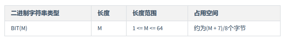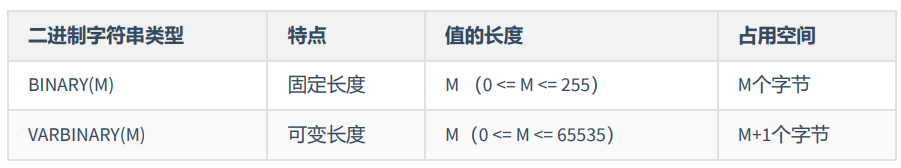 BINARY(M)为固定长度的二进制字符串,M表示最多能存储的字节数,取值范围是0~255个字符。如果未指定(M),表示只能存储1个字节 。例如BINARY (8),表示最多能存储8个字节,如果字段值不足(M)个字节,将在右边填充’\0’以补齐指定长度。