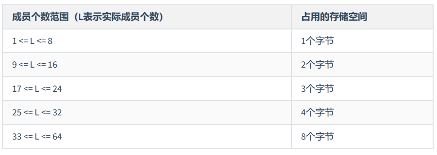 当SET类型包含的成员个数不同时,其所占用的存储空间也是不同的,具体如下: