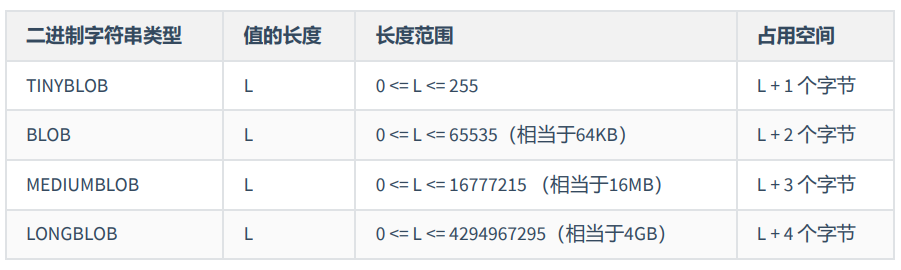 - MySQL中支持的二进制字符串类型主要包括BINARY、VARBINARY、TINYBLOB、BLOB、MEDIUMBLOB和 LONGBLOB类型。