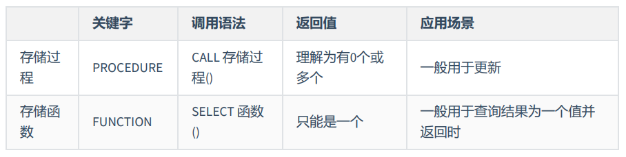- 一旦存储过程被创建出来,使用它就像使用函数一样简单,我们直接通过调用存储过程名即可。相较于 函数,存储过程是没有返回值的。