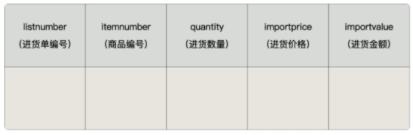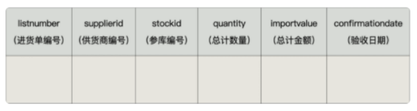 假设我们用进货单头表 (demo.importhead)来保存进货单的总体信息,包括进货单编号、供货商编 号、仓库编号、总计进货数量、总计进货金额和验收日期。