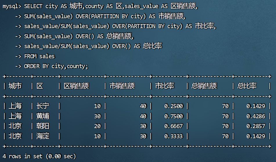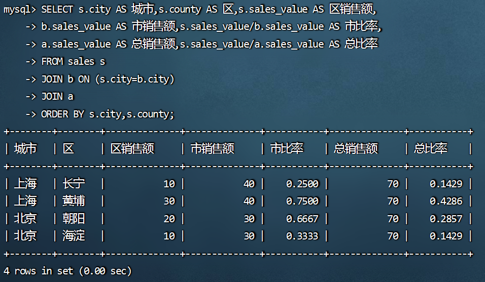 4 rows in set (0.00 sec)需求:现在计算这个网站在每个城市的销售总额、在全国的销售总额、每个区的销售额占所在城市销售额中的比率,以及占总销售额中的比率。