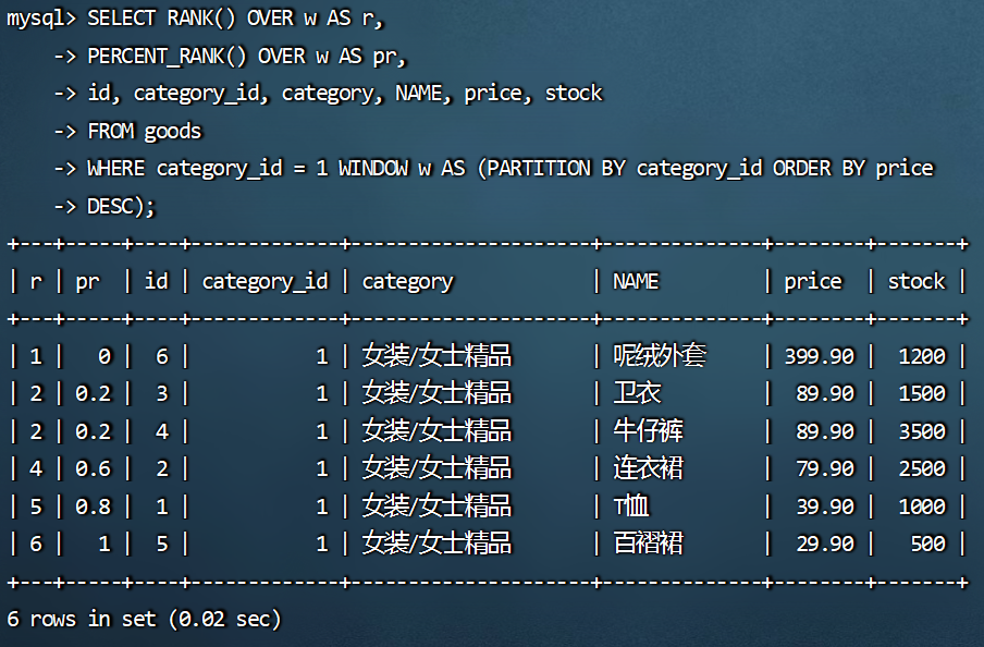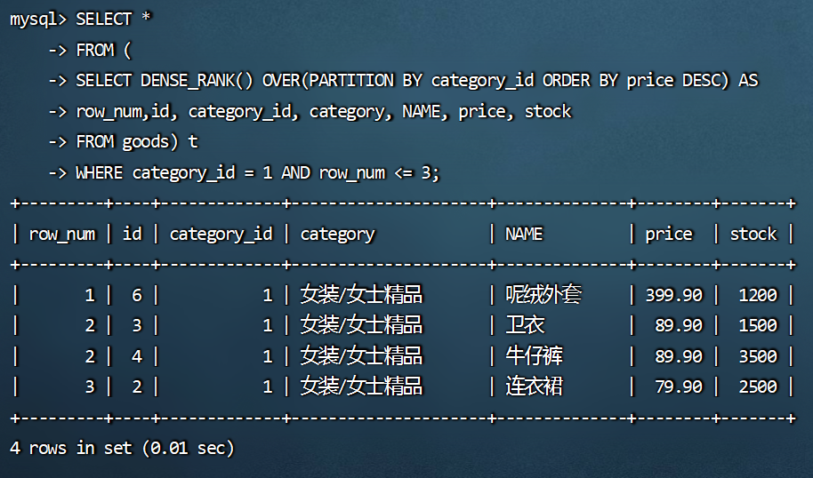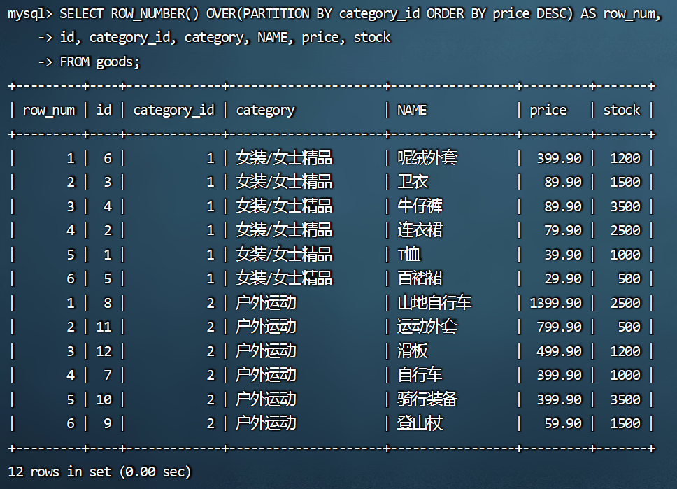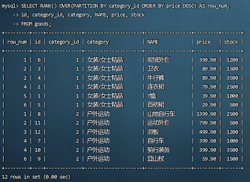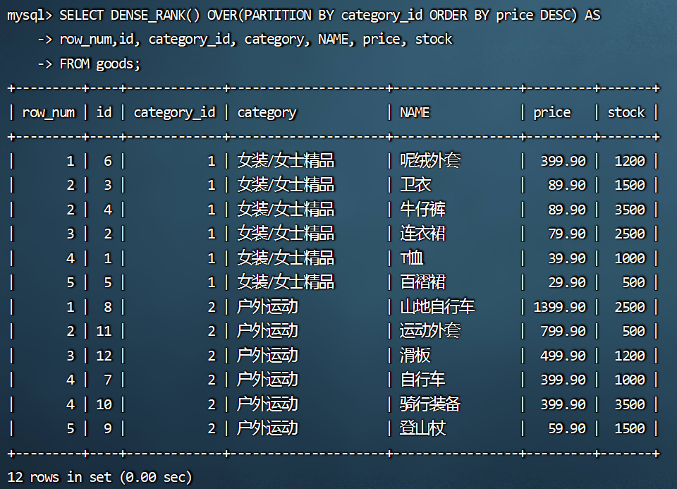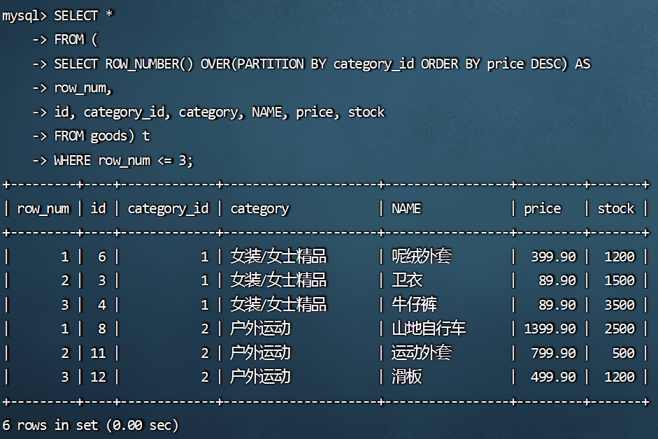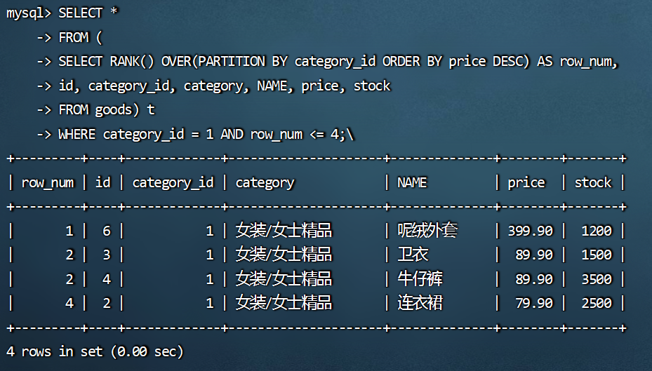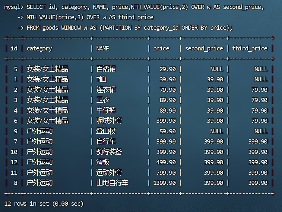 WINDOW w AS (PARTITION BY category_id ORDER BY price)) t;![]()