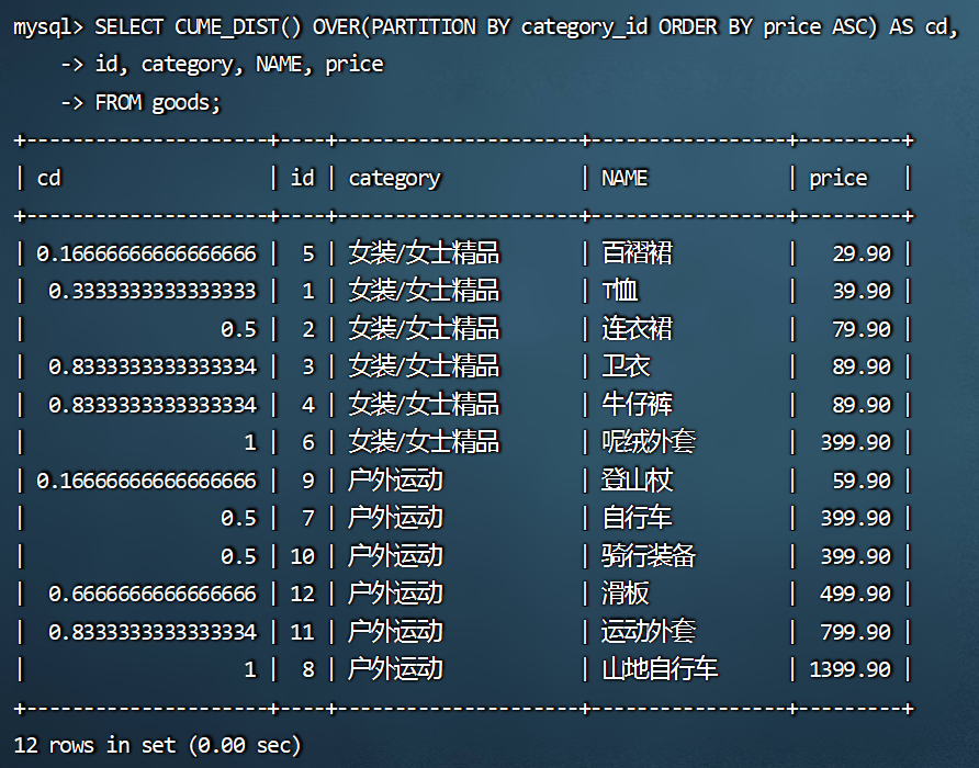 SELECT CUME_DIST() OVER(PARTITION BY category_id ORDER BY price ASC) AS cd,