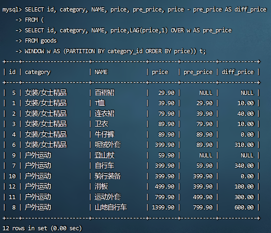 SELECT id, category, NAME, price,LAG(price,1) OVER w AS pre_price