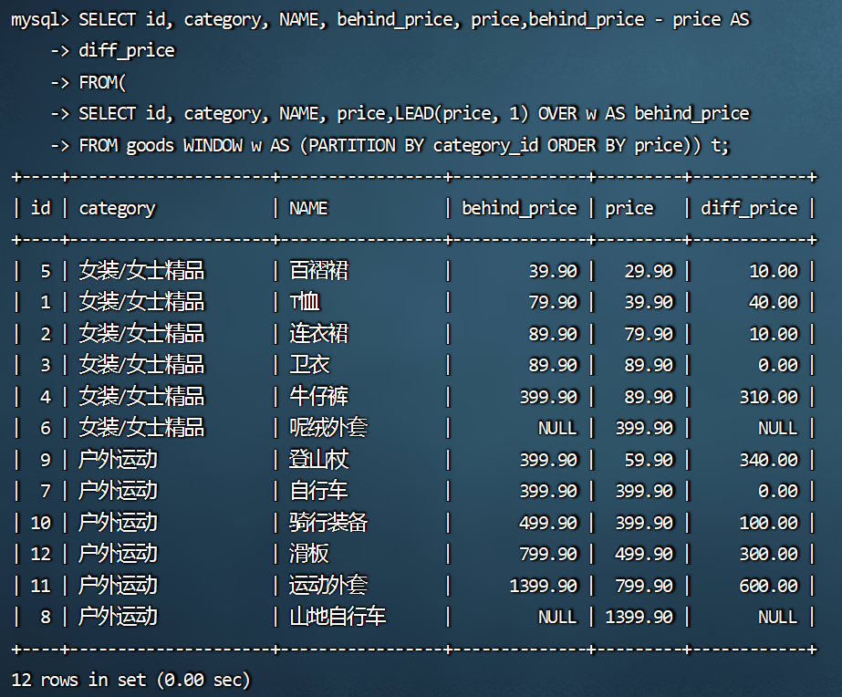 SELECT id, category, NAME, price,LEAD(price, 1) OVER w AS behind_price