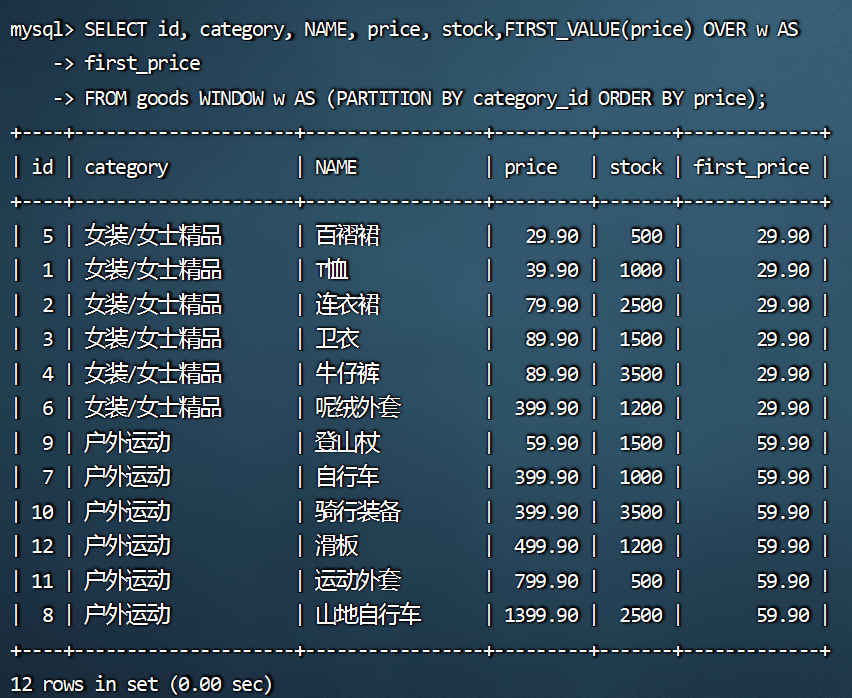 SELECT id, category, NAME, price, stock,FIRST_VALUE(price) OVER w AS first_price