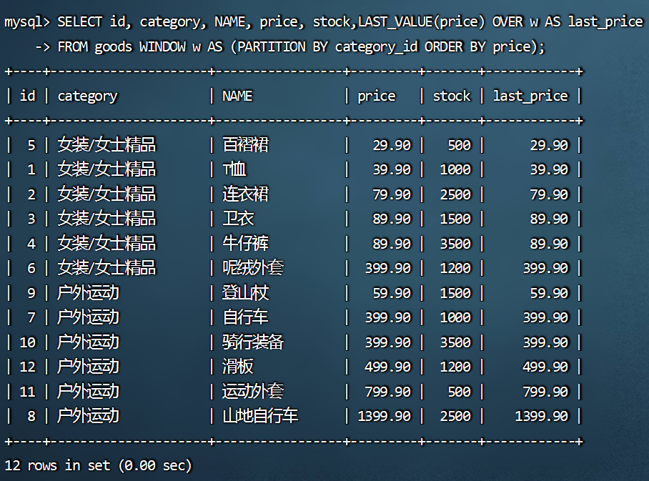 SELECT id, category, NAME, price, stock,LAST_VALUE(price) OVER w AS last_price