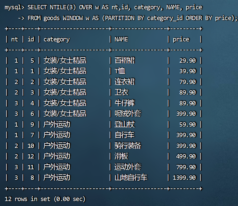 SELECT NTILE(3) OVER w AS nt,id, category, NAME, price