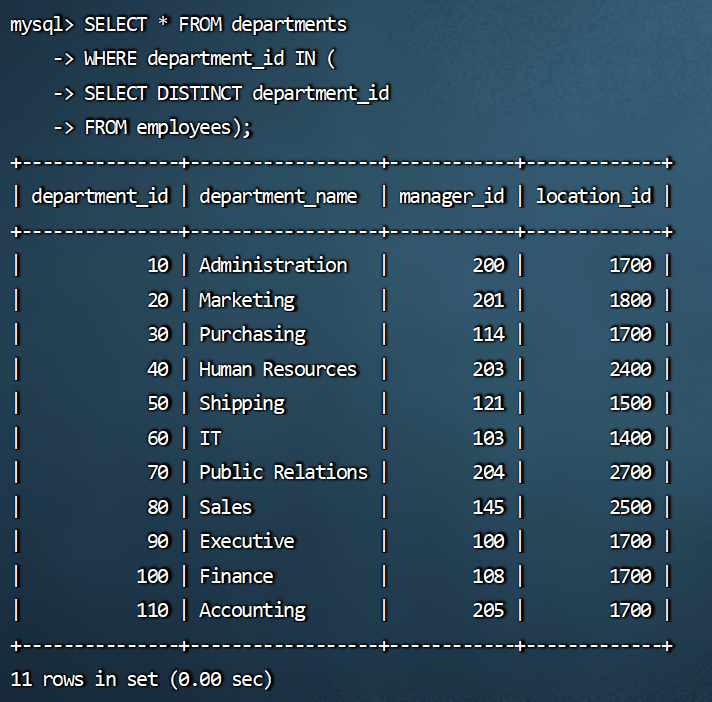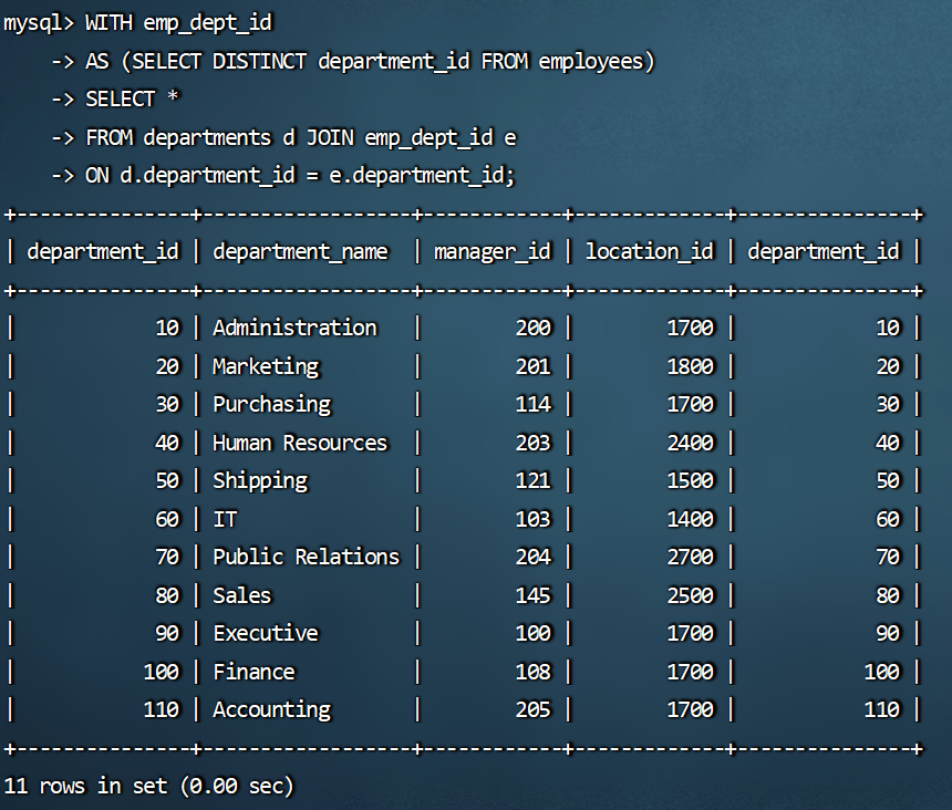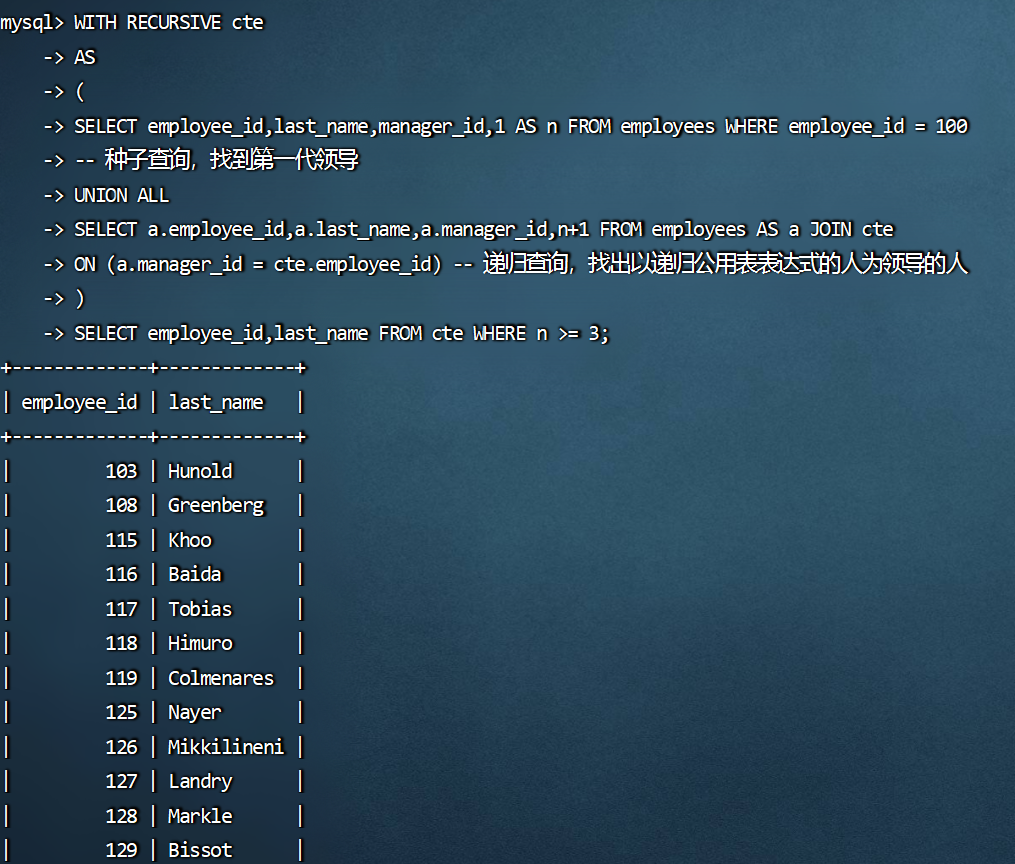 - 用递归公用表表达式中的递归查询,查出以这个递归公用表表达式中的人为管理者的人,并且代次的值加 1。直到没有人以这个递归公用表表达式中的人为管理者了,递归返回。